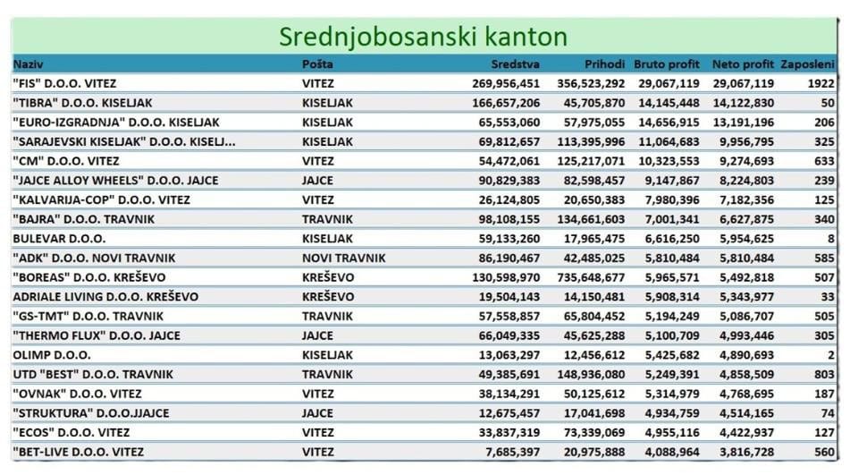 Na prvom mjestu najuspješnijih je „FIS“ d.o.o. Prošlogodišnja dobit iznosila je 29.067.119 KM, a prihodi 356.523.292 KM. FIS zapošljava 1.922 radnika.