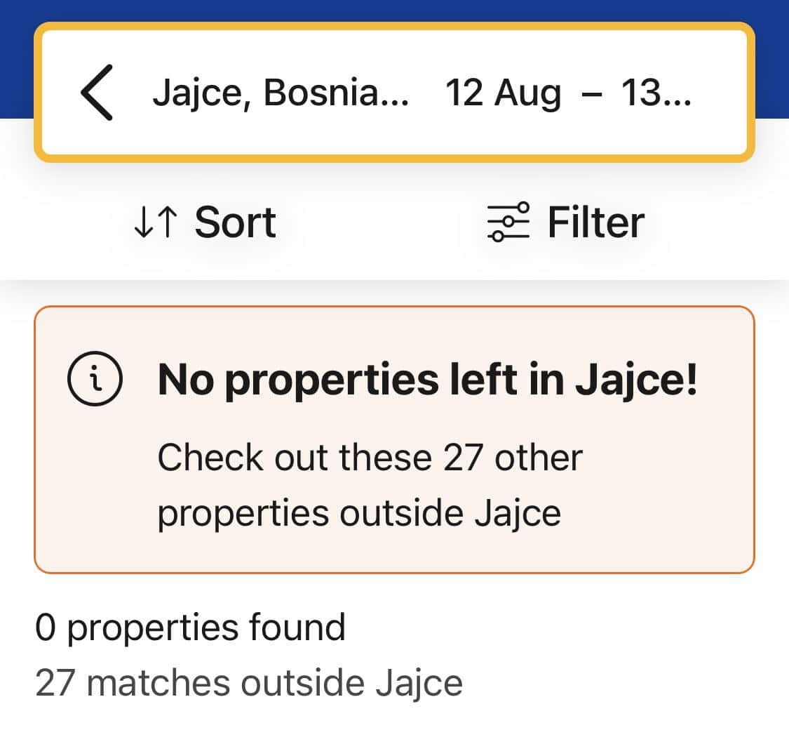 Ukoliko ste danas pokušali putem popularne web stranice booking.com u Jajcu pronaći smještaj mogli ste bit neugodno iznenađeni. Naime, kako prikazuje slika, danas u Jajcu i bližoj okolici nema niti jedan slobodan krevet.
