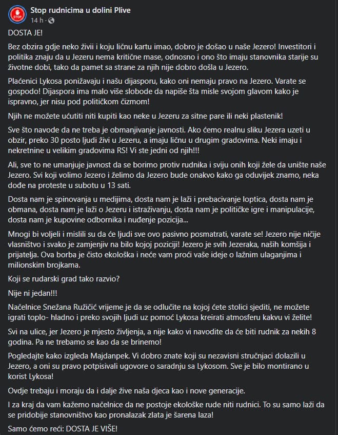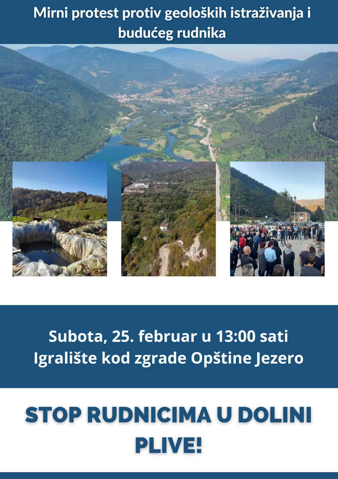 Skupina aktivista koja se protivi geološkim istraživanjima i pokretanju rudnika na području općine Jezero svoje stavove iznosi putem FaceBook stranice Stop rudnicima u dolini Plive. Zabrinuti aktivisti su za subotu 25. veljače najavili mirne prosvjede ispred zgrade Općine Jezero u 13 sati.
