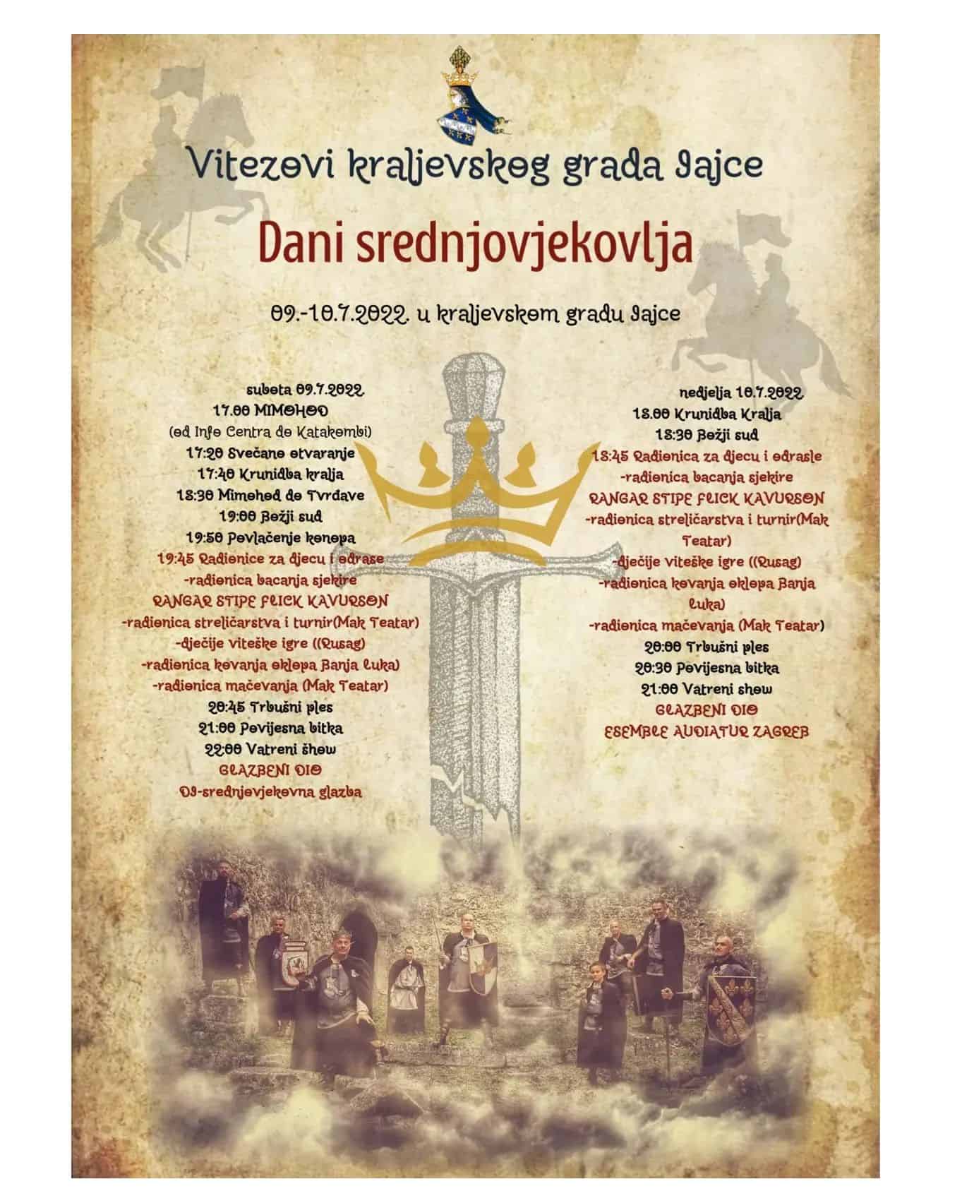 Udruga Vitezovi kraljevskog grada Jajca i ove godine nas vraća u prošla stoljeća. Kako i priliči našem gradu i našim Vitezovima, na Danima srednjovjekovlja okupiti do sada najveći broj povijesnih udruga i skupina. Veliko je to priznanje našim vitezovima ali i kraljevskom gradu Jajcu. Jajce, kraljevska prijestolnica srednjevjekovne Bosne više od bilo kojeg drugog grada u BiH zaslužuje ovakvu manifestaciju, za koju se nadamo da će s godinama rasti, razvijati se i napredovati.