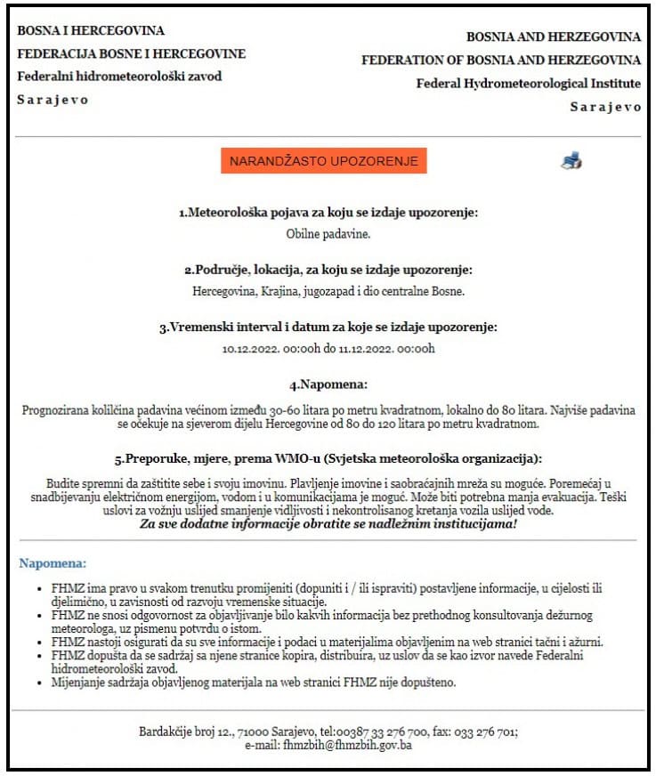 Upozorenje se odnosi na područja Hercegovine, Krajine, jugozapadne i dio centralne Bosne. Obilne padavine očekuju se na području Mostara, Sarajeva, Tuzle, Foče i Trebinja. Na navedenim područjima očekuje se da će pasti od 30 do 60 litara kiše po metru kvadratnom, lokalno i do 80 litara.