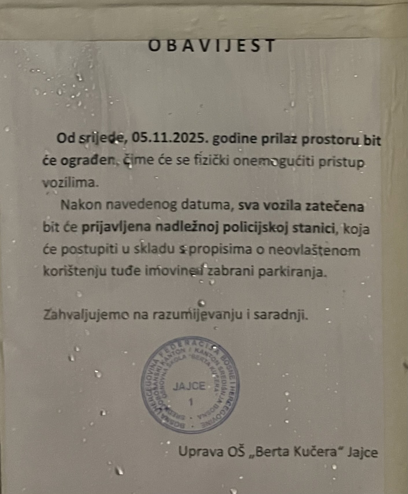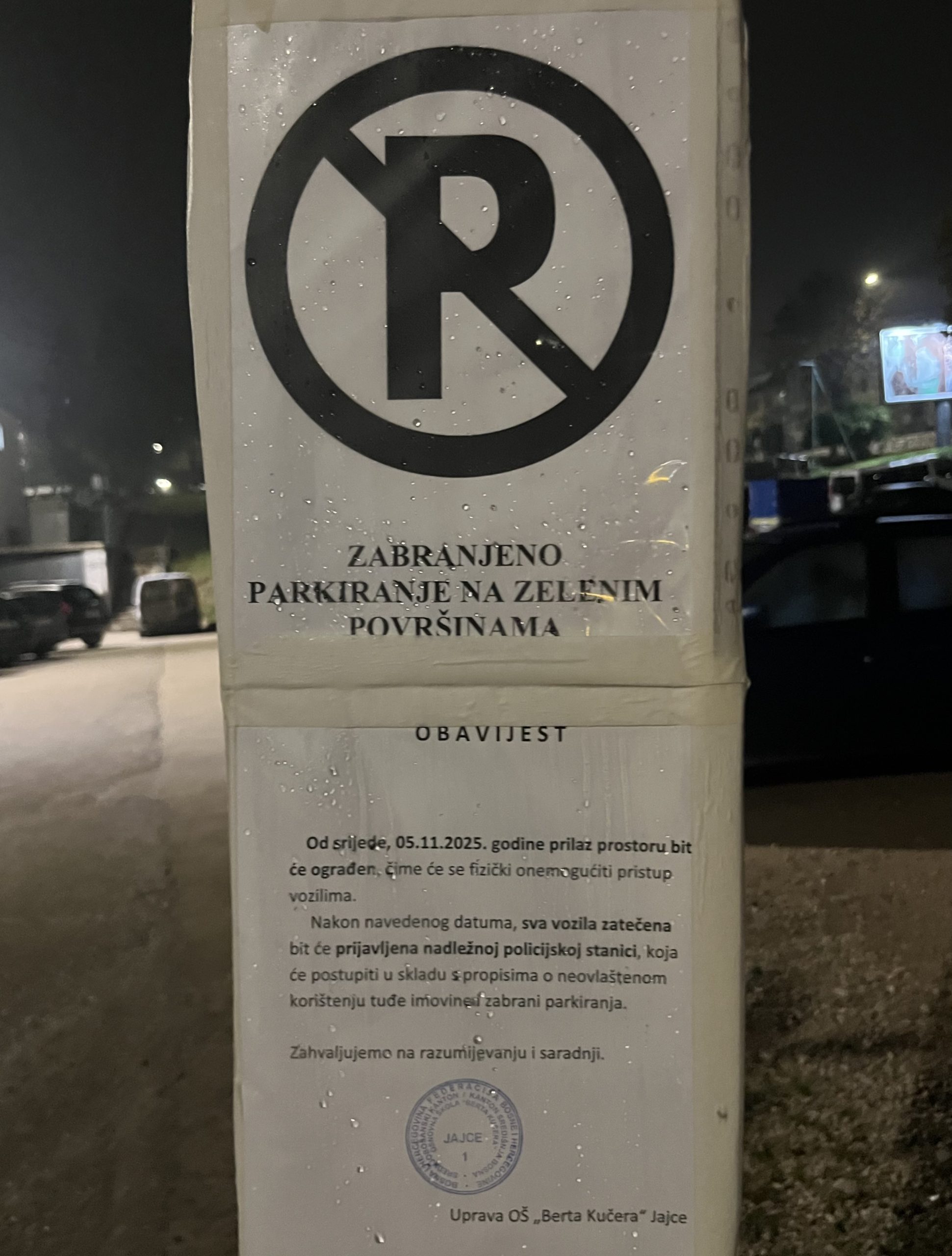 Naime, kako je vidljivo iz fotografija Osnovna škola “Berta Kučera” Jajce bila je odlučila zabraniti parkiranje na parkingu ispred sportske dvorane te najavila da će prostor biti ograđen a eventualni prekršitelji zabrane sankcionirani. Planirano je da parking bude trajno fizički ograđen od 5. studenog ove godine.