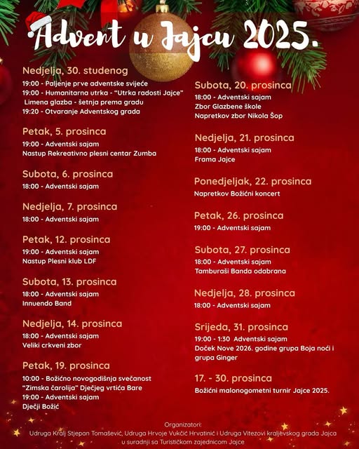 U sklopu Adventa u Jajcu i ove godine će biti organiziran doček Nove 2026. godine. Ovaj put će nas u Novu 2026. godinu uvesti bendovi Boja Noći i grupa Ginger.