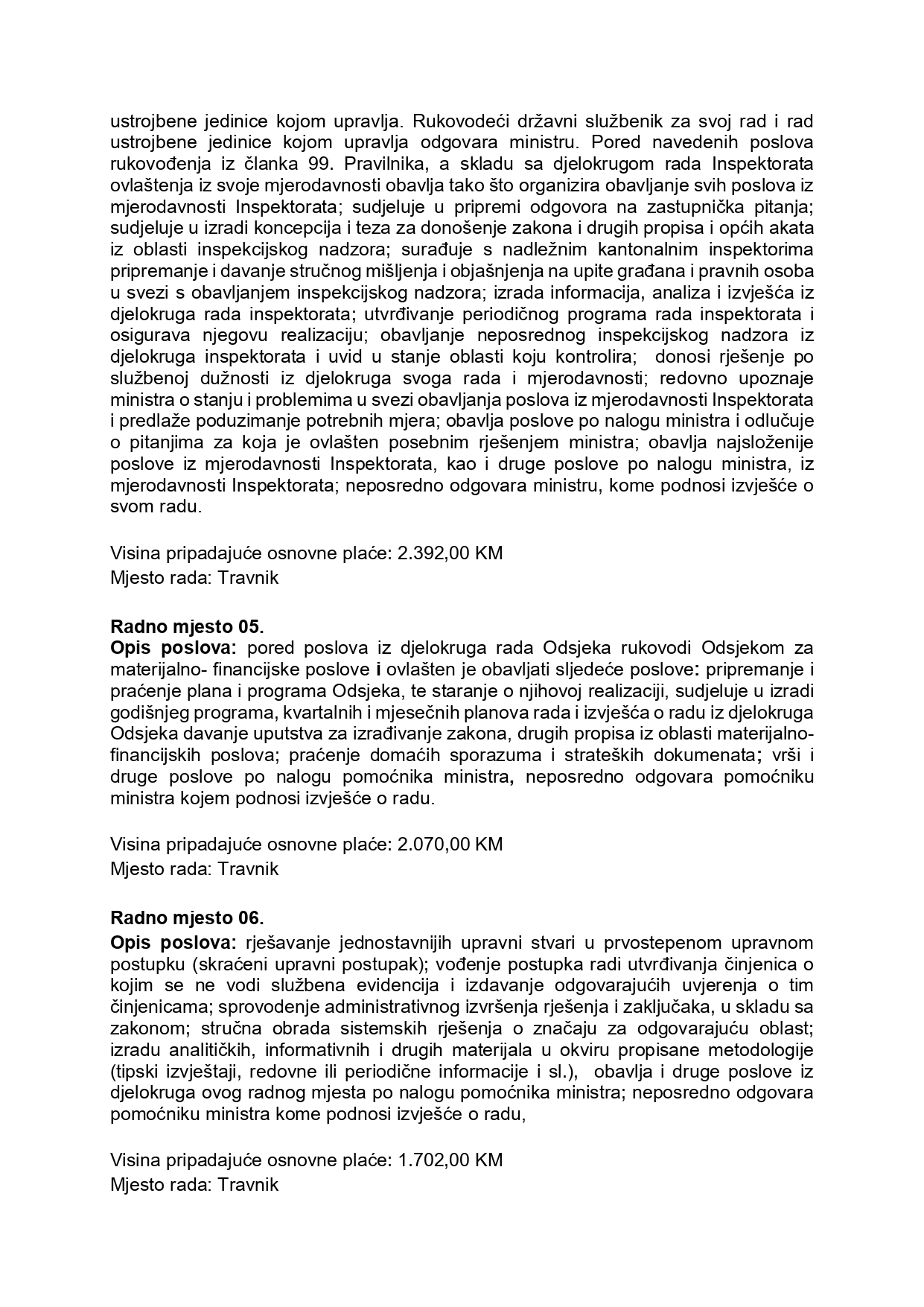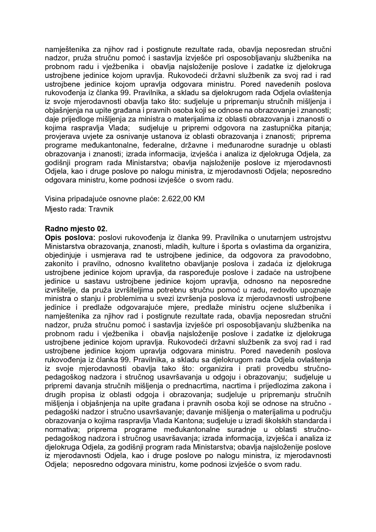 Datum objave na web-u je 07.11.2025, a natječajem je raspisana popuna šest radnih mjesta: Pomoćnik ministra za obrazovanje i znanstvenu djelatnost u Odjelu za obrazovanje i znanstvenu djelatnost; Pomoćnik ministra za stručno pedagoški nadzor i stručno usavršavanje u odgoju i obrazovanju u Odjelu za stručno pedagoški nadzor i stručno usavršavanje u odgoju i obrazovanju; Pomoćnik ministra za kulturu, šport, mlade i informiranje u Odjelu za kulturu, šport, mlade i informiranje; Glavni kantonalni inspektor u Inspektoratu; Šef Odsjeka za materijalno-financijske poslove u Odjelu za materijalno-financijske poslove i unos podataka; Stručni suradnik za pravne poslove u Odjelu za opće i pravne poslove.