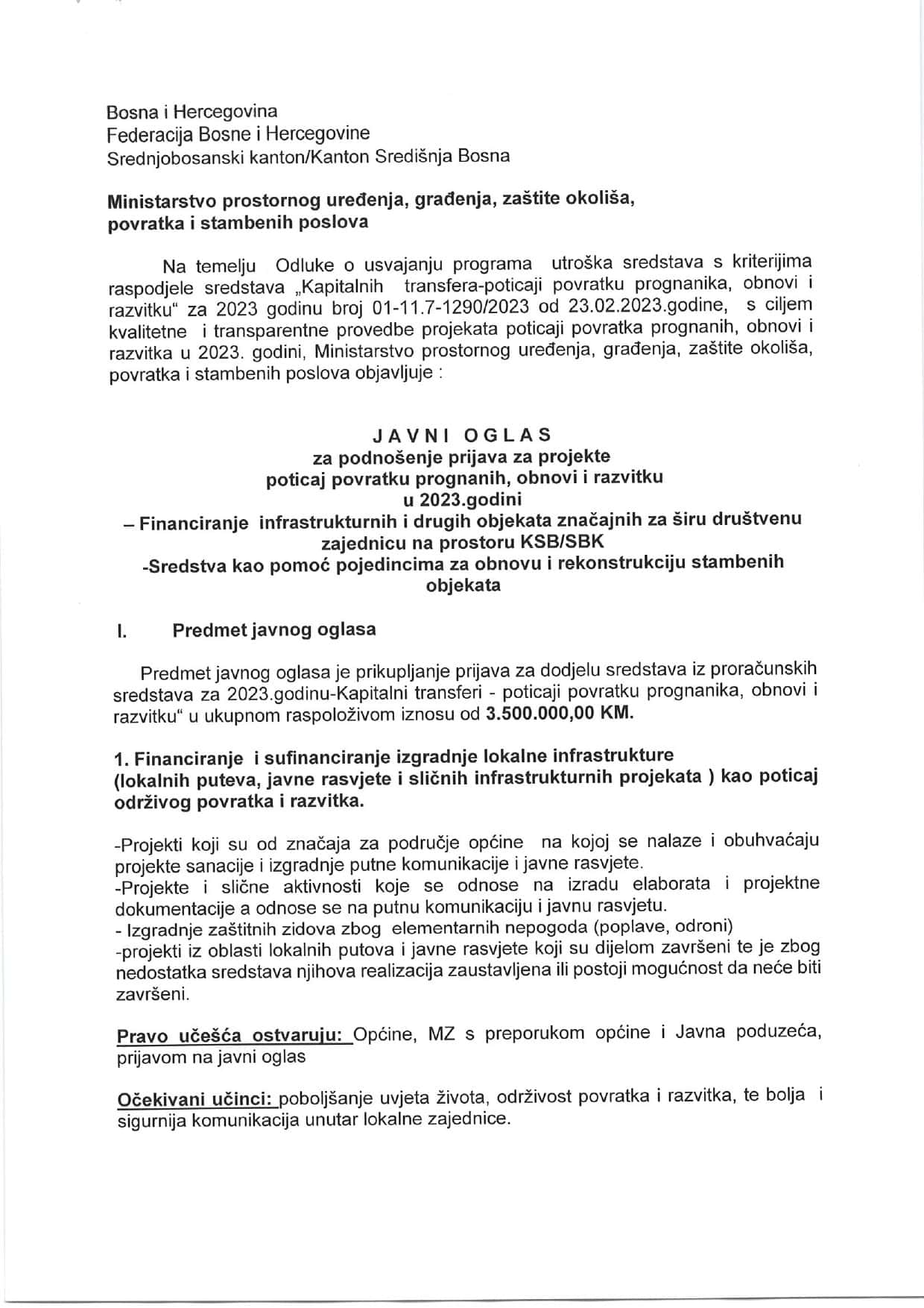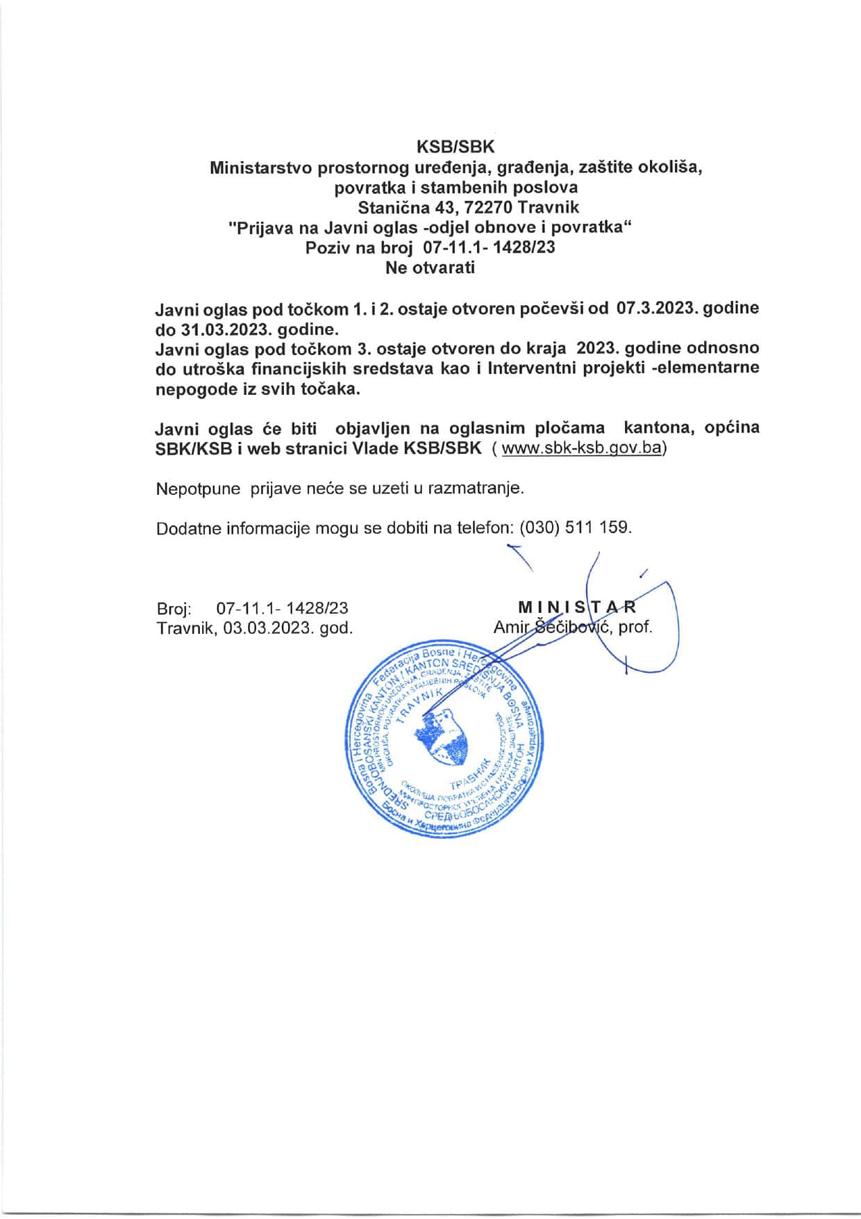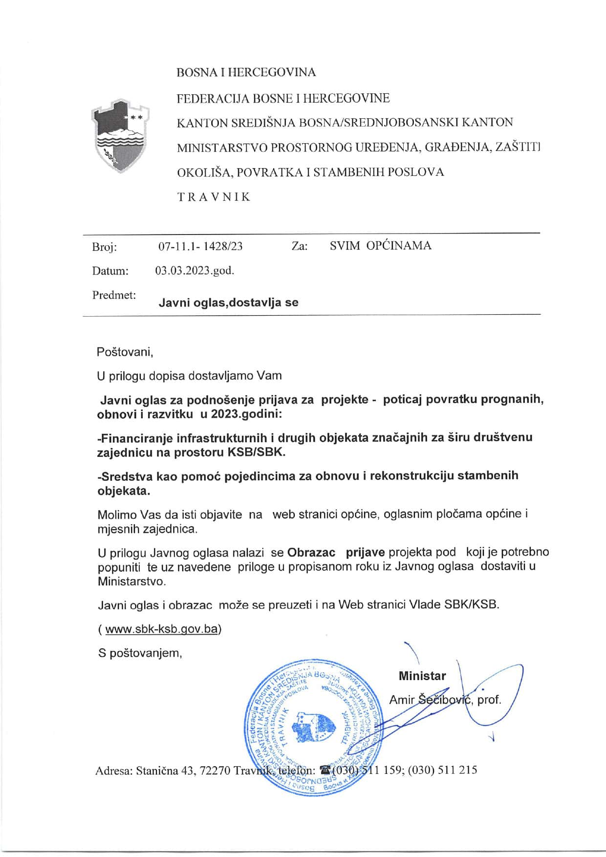 Ministarstvo prostornog uređenja, građenja, zaštite okoliša, povratka i stambenih poslova objavljuje: