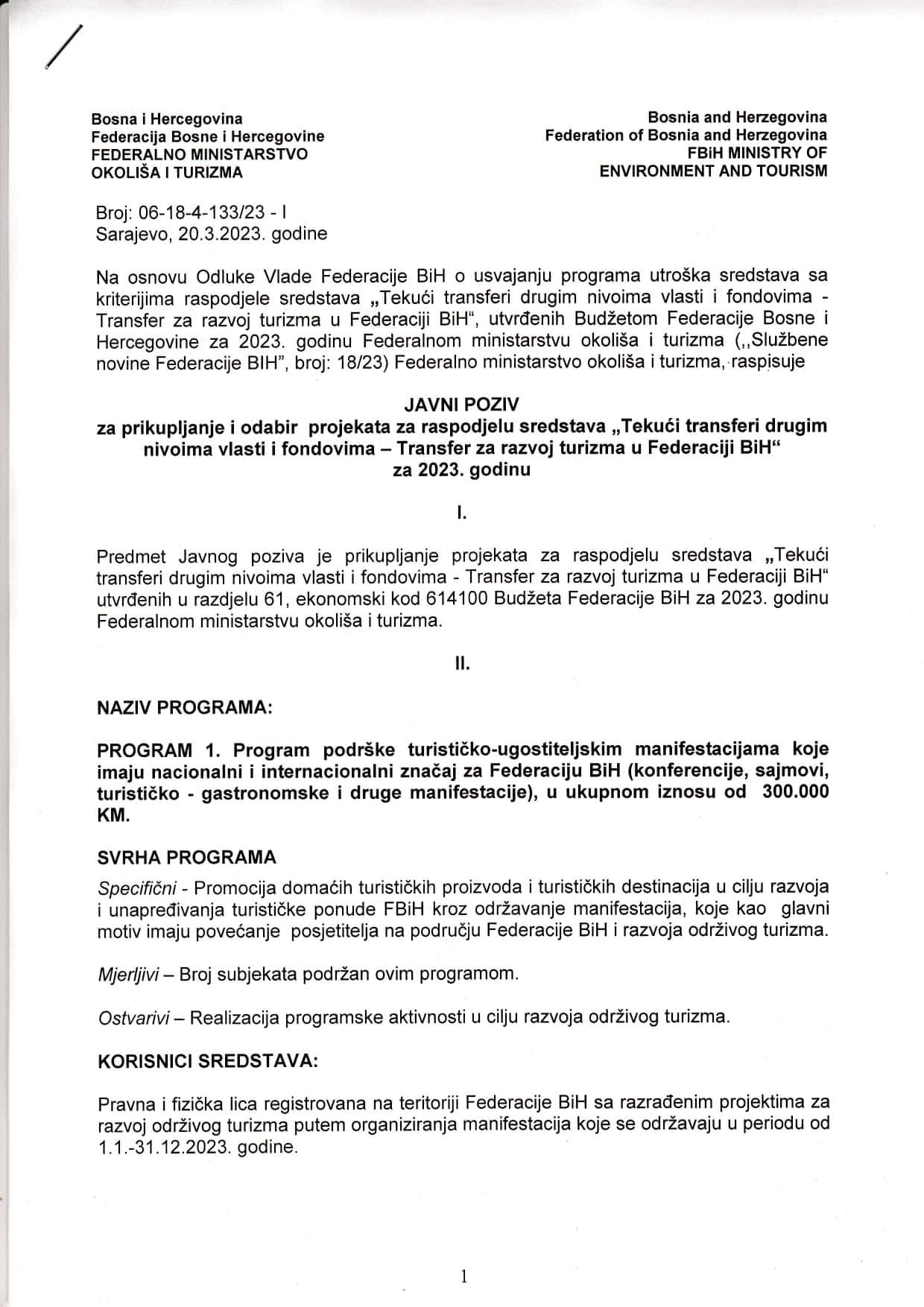 PROGRAM 1. Program podrške turističko-ugostiteljskim manifestacijama koje imaju nacionalni i internacionalni značaj za Federaciju BiH (konferencije, sajmovi, turističko – gastronomske i druge manifestacije) u ukupnom iznosu od 300.000 KM. Svrha ovog Programa je promocija domaćih turističkih proizvoda i turističkih destinacija u cilju razvoja i unapređivanja turističke ponude FBiH kroz održavanje manifestacija, koje kao glavni motiv imaju povećanje posjetitelja na području Federacije BiH i razvoja održivog turizma. Korisnici sredstava mogu biti pravna i fizička lica registrirana na teritoriji Federacije BiH sa razrađenim projektima za razvoj održivog turizma putem organiziranja manifestacija koje se održavaju u periodu od 1.1. do 31.12.2023. godine.