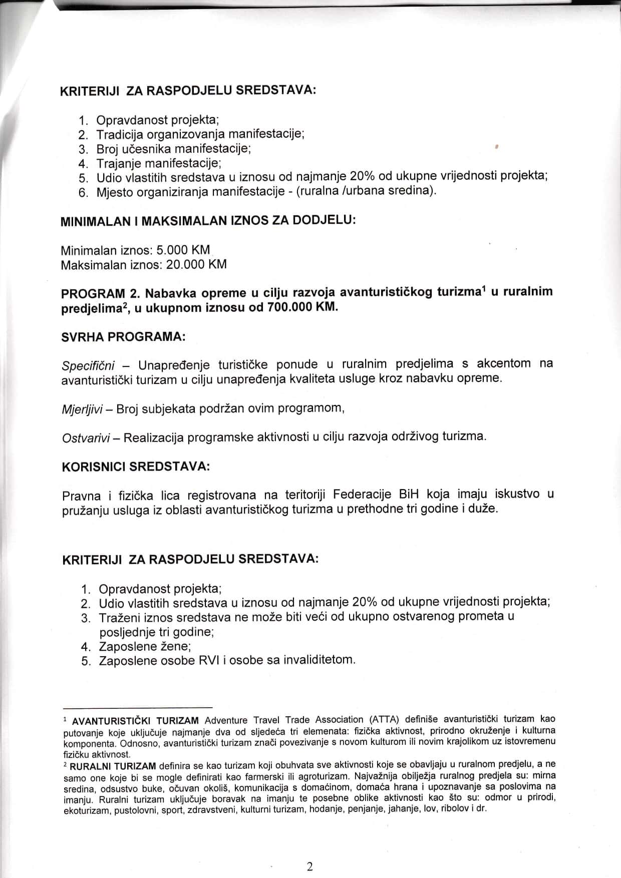 PROGRAM 2. Nabavka opreme u cilju razvoja avanturističkog turizma u ruralnim predjelima u ukupnom iznosu od 700.000 KM. Svrha programa unaprjeđenje turističke ponude u ruralnim predjelima s akcentom na avanturistički turizam u cilju unaprjeđenja kvaliteta usluge kroz nabavku opreme. Korisnici sredstava mogu biti pravna i fizička lica registrirana na teritoriji Federacije BiH koja imaju iskustvo u pružanju usluga iz oblasti avanturističkog turizma u prethodne tri godine i duže.