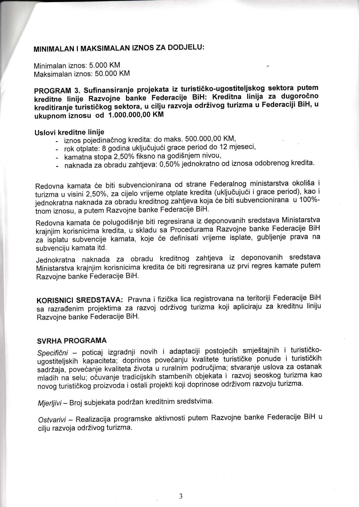 PROGRAM 3. Sufinanciranje projekata iz turističko-ugostiteljskog sektora putem kreditne linije Razvojne banke Federacije BiH: Kreditna linija za dugoročno kreditiranje turističkog sektora u cilju razvoja održivog turizma u Federaciji BiH u ukupnom iznosu od 1.000.000,00 KM. Korisnici sredstava mogu biti pravna i fizička lica registrirana na teritoriji Federacije BiH sa razrađenim projektima za razvoj održivog turizma koji apliciraju za kreditnu liniju Razvojne banke Federacije BiH.