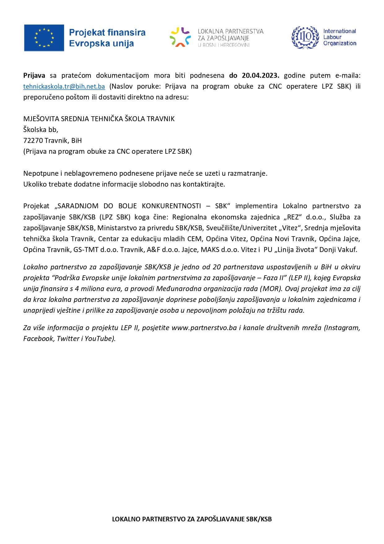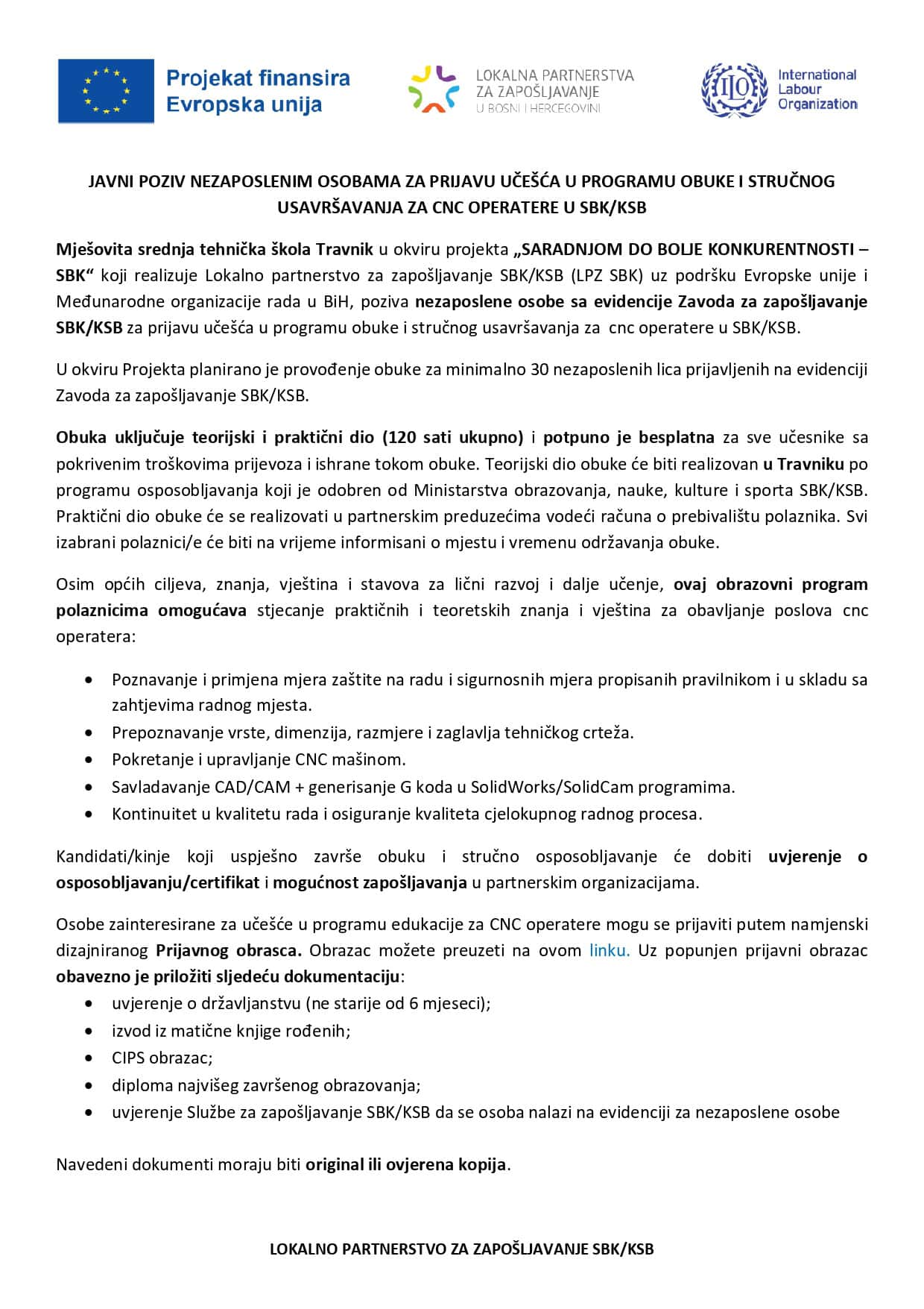 U okviru projekta “Saradnjom do bolje konkurentnosti – SBK“ u koji je uključena i Općine Jajce, raspisan je Javni poziv za nezaposlene osobe sa evidencije Službe za zapošljavanje SBK/KSB za prijavu učešća u programu obuke i stručnog usavršavanja za CNC operatere u SBK/KSB.