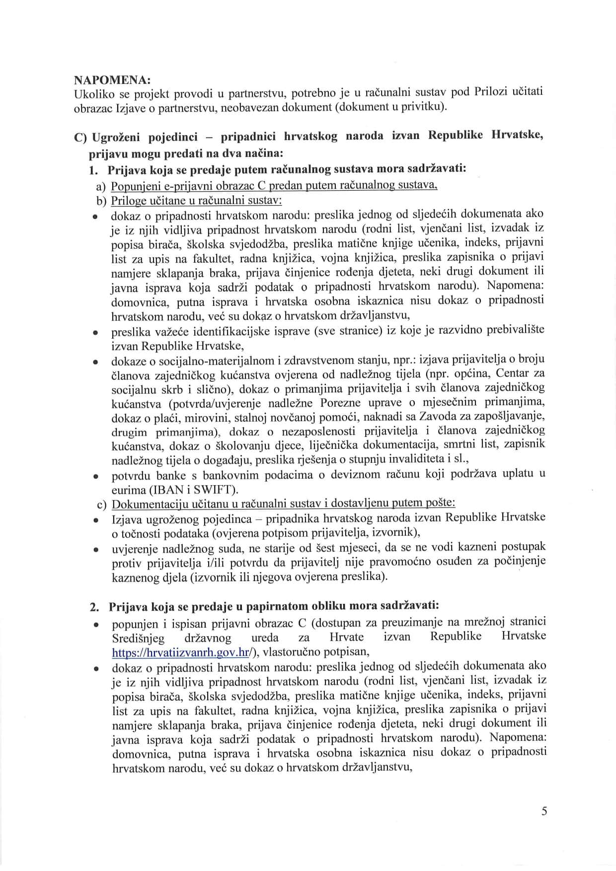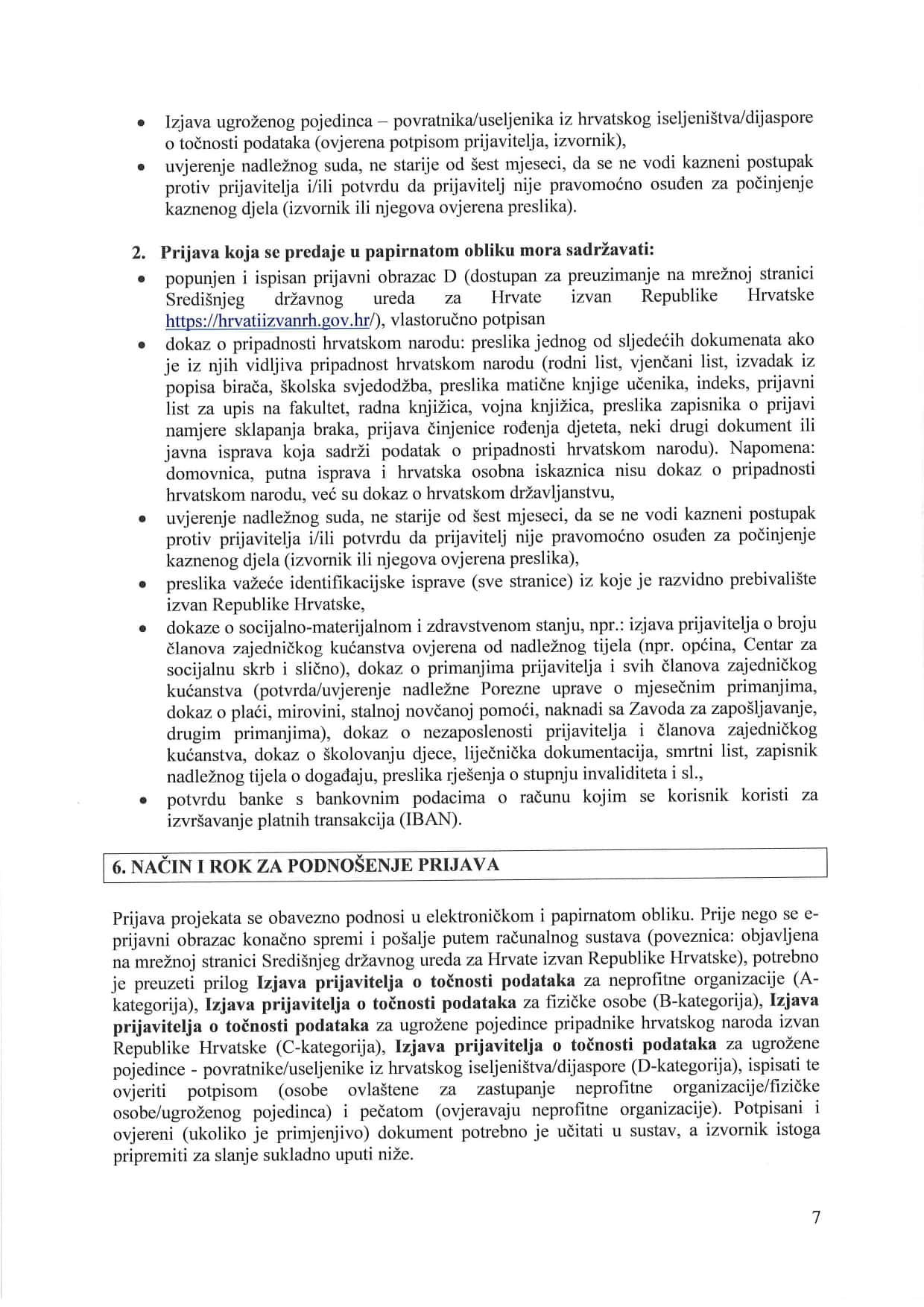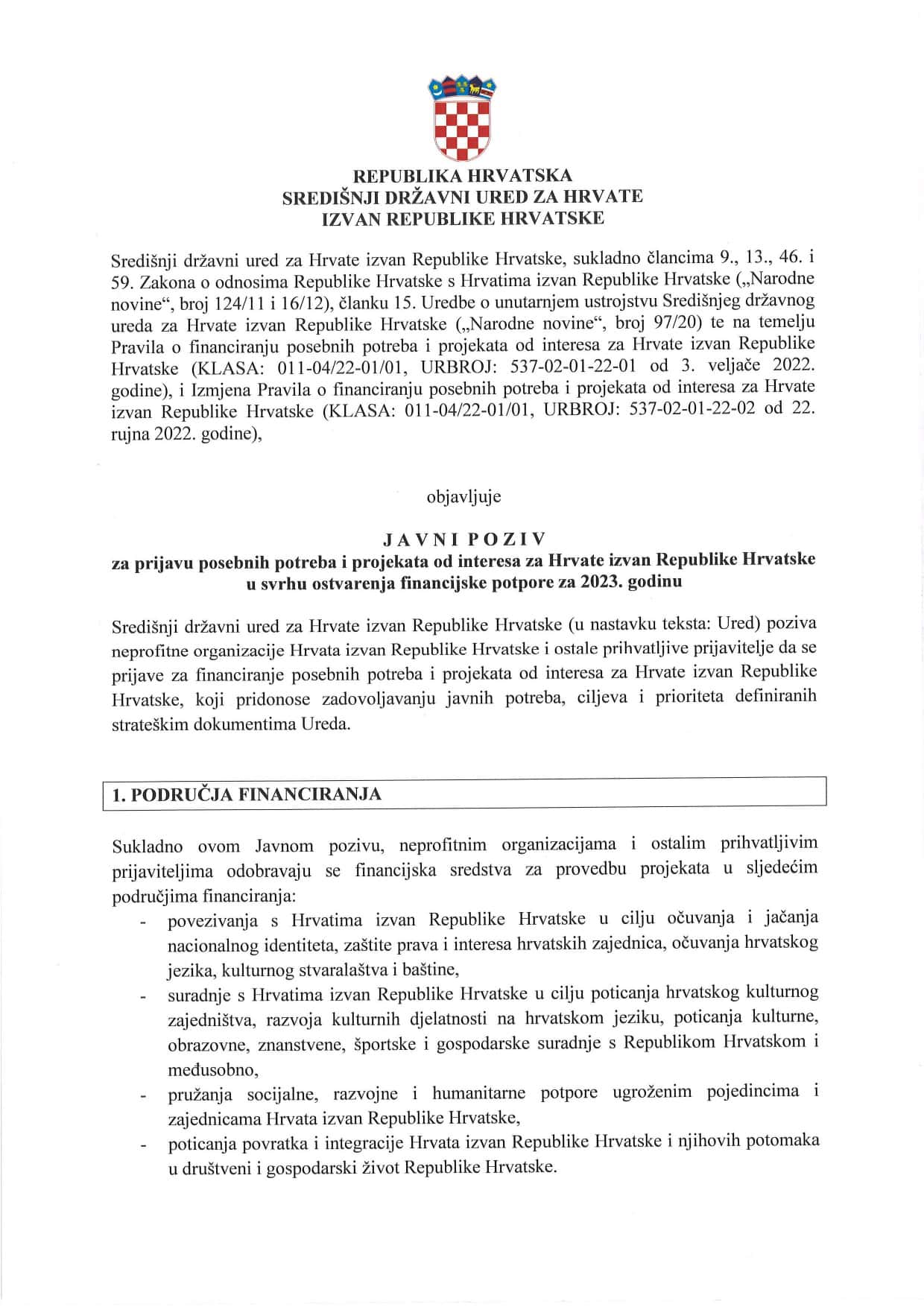 Središnji državni ured za Hrvate izvan Republike Hrvatske objavio je 1. Javni poziv za prijavu posebnih potreba i projekata od interesa za Hrvate izvan Republike Hrvatske u svrhu ostvarenja financijske potpore za 2023. godinu.