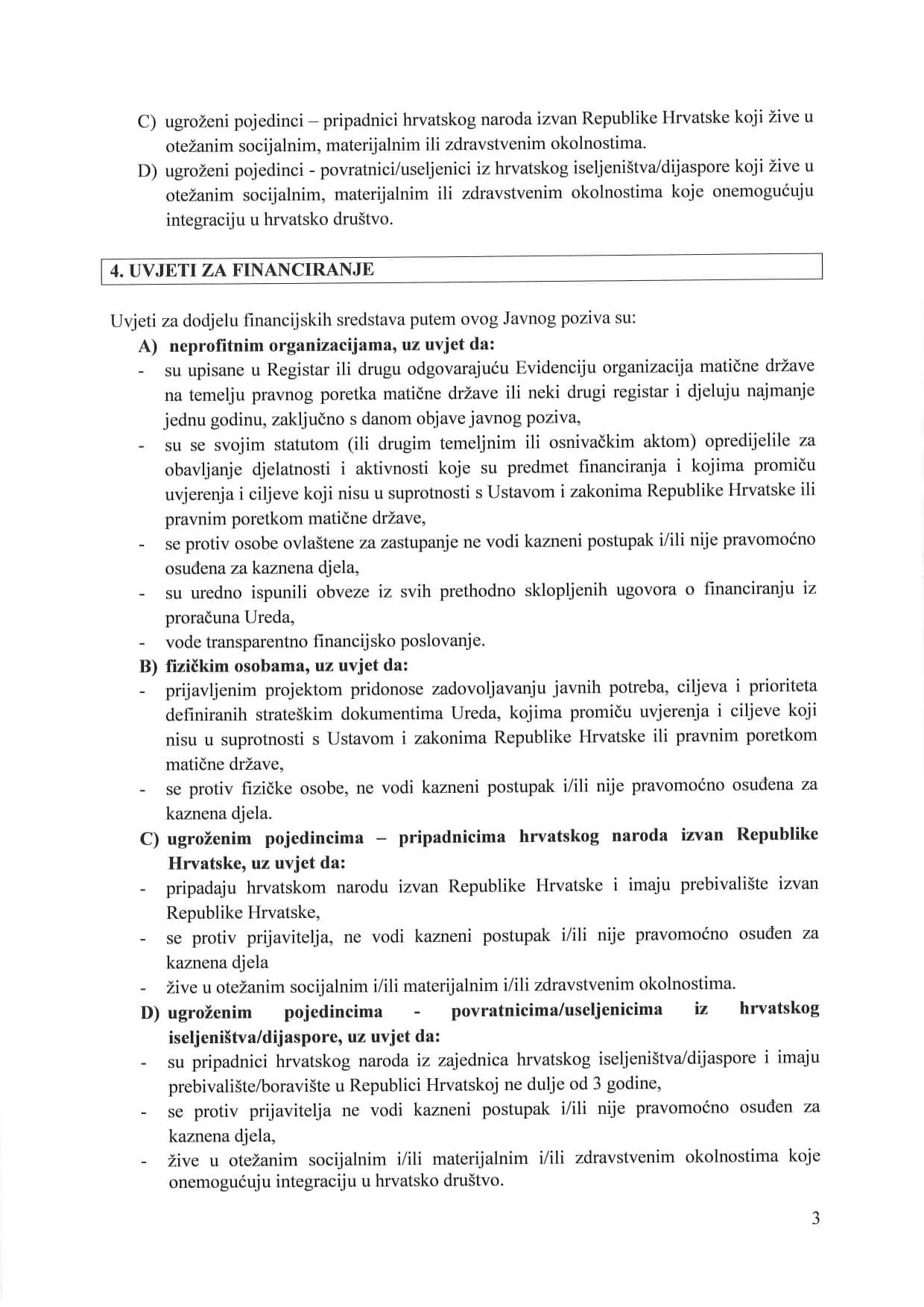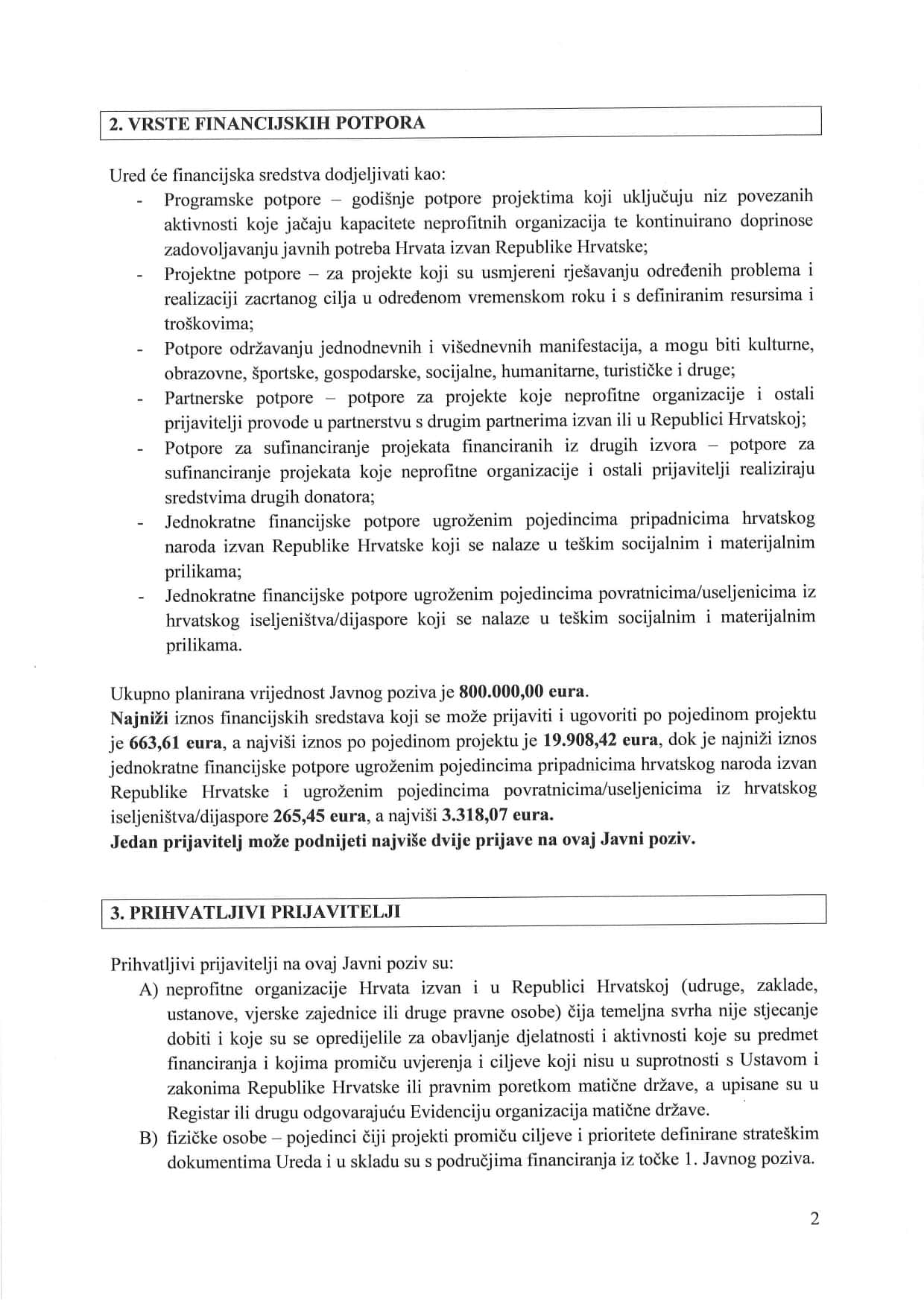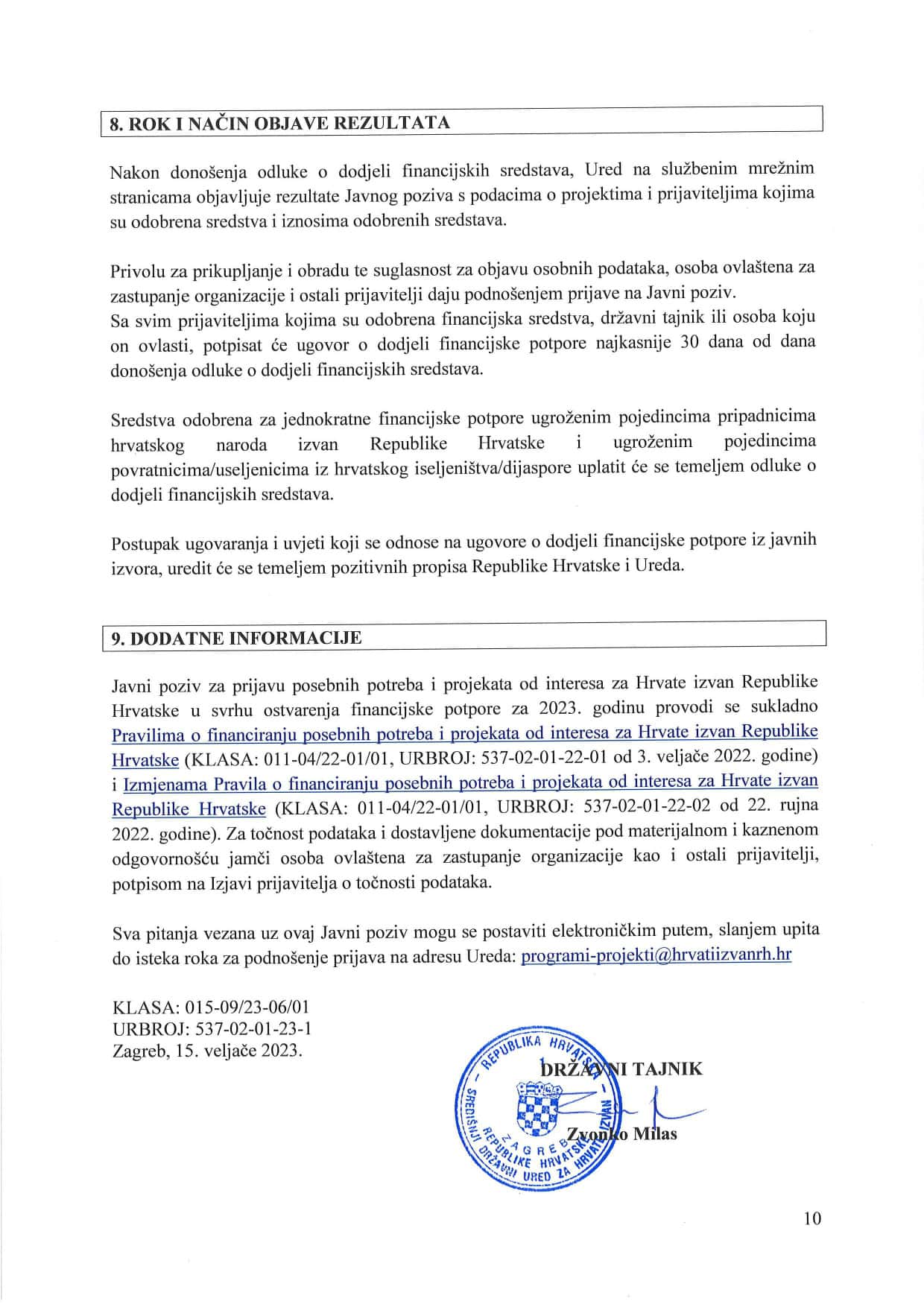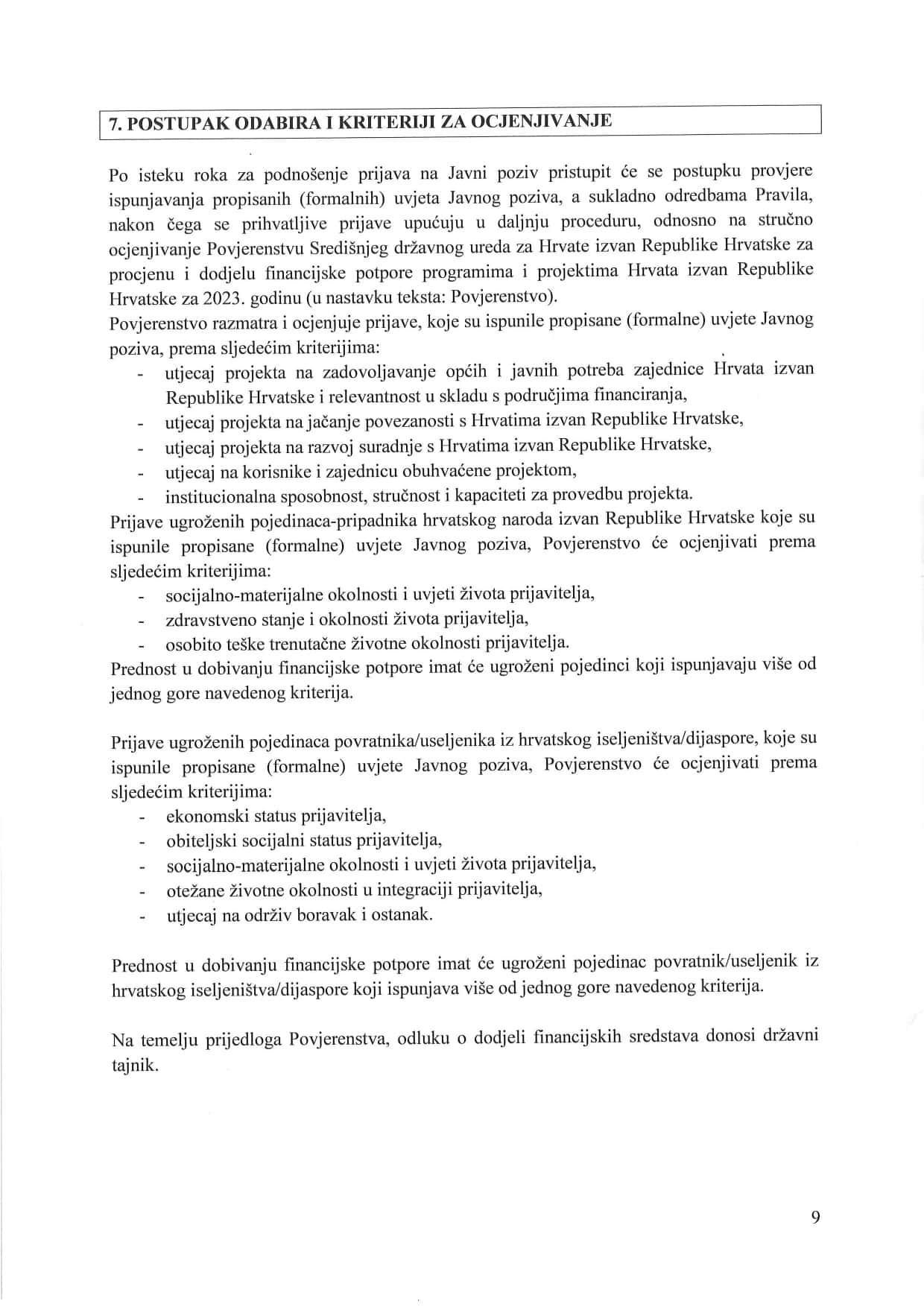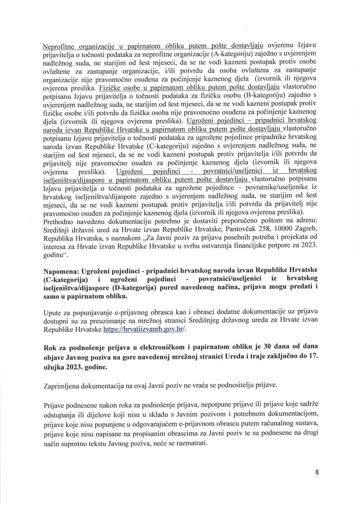 U cilju promicanja veza i jačanja suradnje Republike Hrvatske s Hrvatima izvan Republike Hrvatske, očuvanja i jačanja nacionalnog identiteta, zaštite prava i interesa hrvatskih zajednica, očuvanja hrvatskog jezika, kulturnog stvaralaštva i baštine te poticanja hrvatskog kulturnog zajedništva, kao i pomoć ugroženim pojedincima – pripadnicima hrvatskog naroda izvan Republike Hrvatske i ugroženim pojedincima – povratnicima/useljenicima iz hrvatskog iseljeništva/dijaspore, Središnji državni ured za Hrvate izvan Republike Hrvatske objavio je 1. Javni poziv za prijavu posebnih potreba i projekata od interesa za Hrvate izvan Republike Hrvatske u svrhu ostvarenja financijske potpore za 2023. godinu.