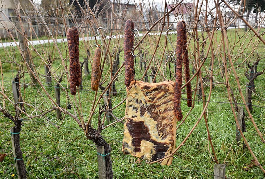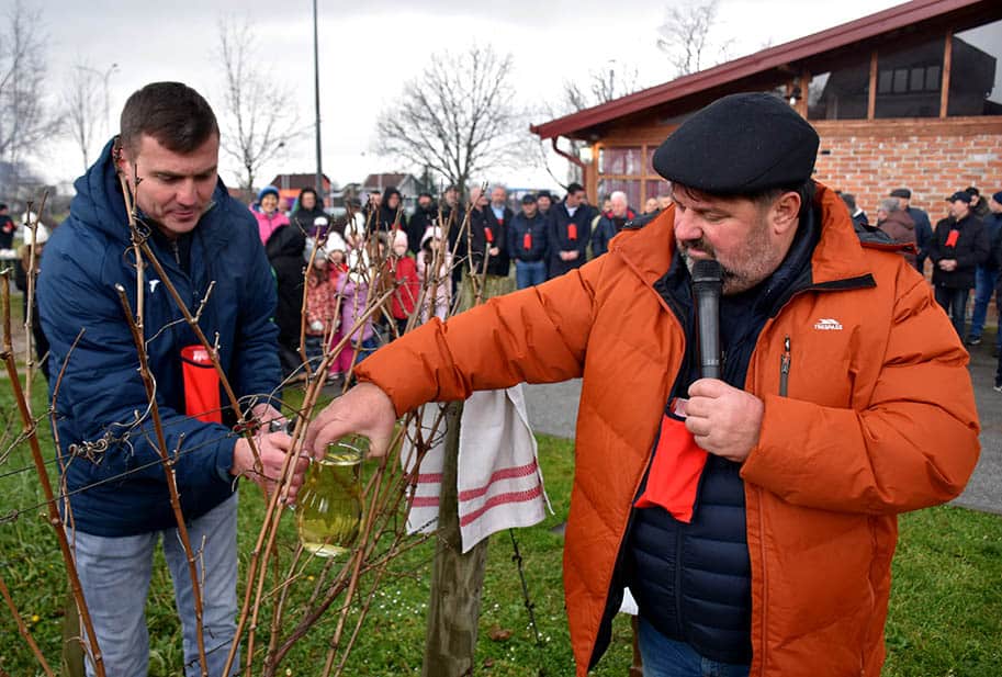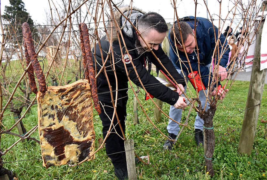 Čokoti su bili okićeni suhomesnatim proizvodima čime su vinogradari iskazali svoja očekivanja da grozdovi budu veliki kao kulin, teški kao slanina, a dugački kao kobasice. Nije se štedjelo ni na mladoj graševini kojom je kum Pavlović obilno zalio orezani čokot.