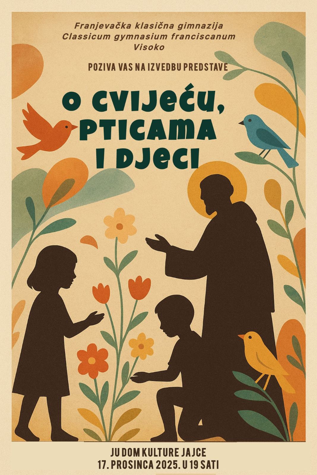 S ponosom najavljujemo izvođenje predstave o životu sv. Franje – „O cvijeću, pticama i djeci”, čiji je tekst napisao prof. Tonči Maleš, ravnatelj Humanističke gimnazije iz Zagreba.