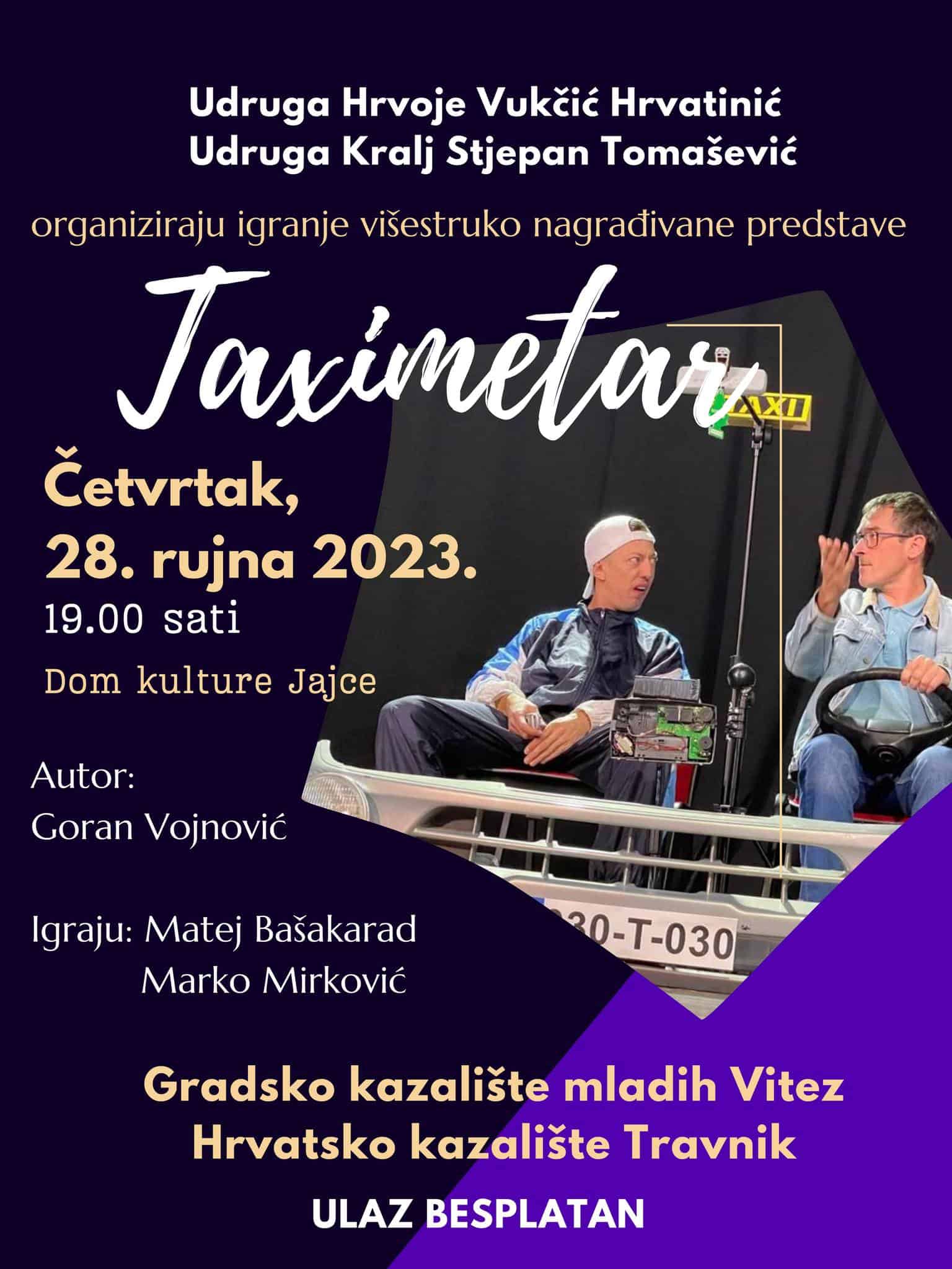 Udruga mladih Hrvoje Vukčić Hrvatinić i Udruga Kralj Stjepan Tomašević iz Jajca organiziraju igranje višestruko nagrađivane predstave “Taximetar” u Domu kulture Jajce