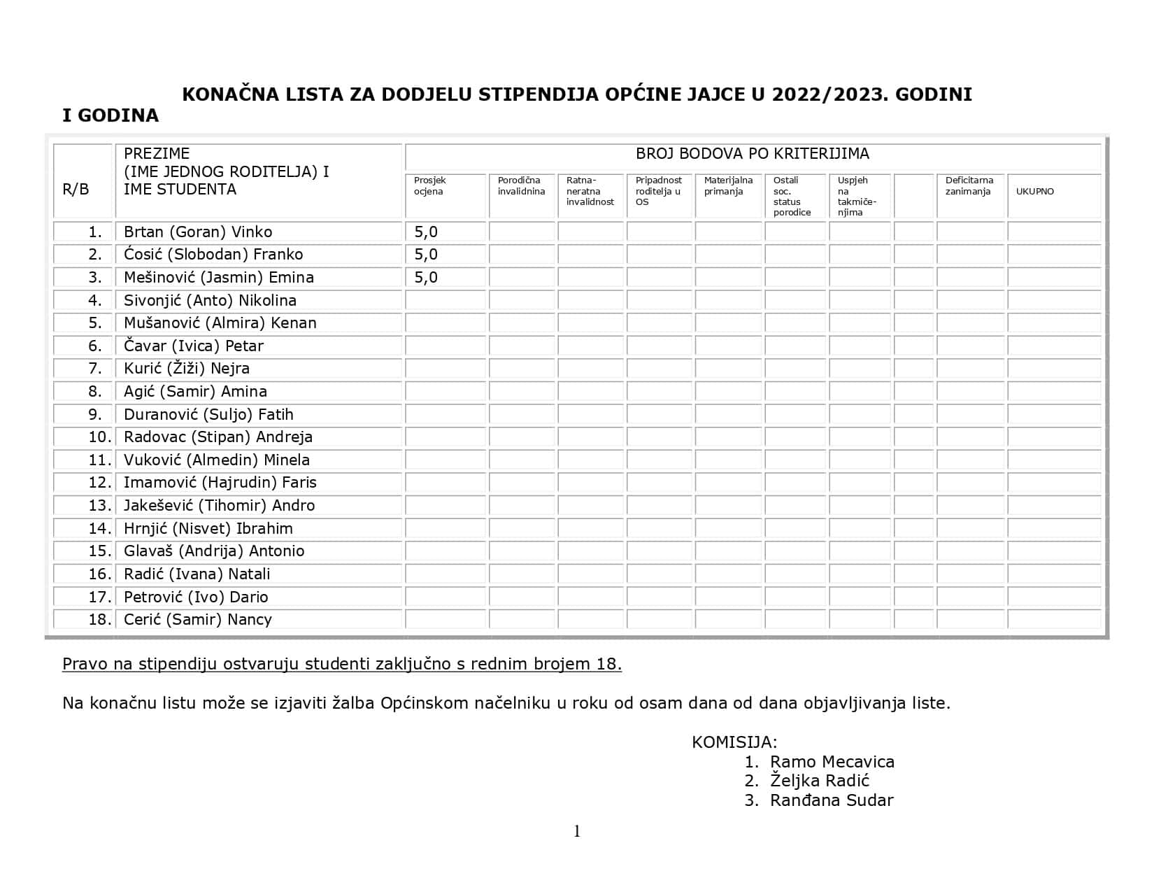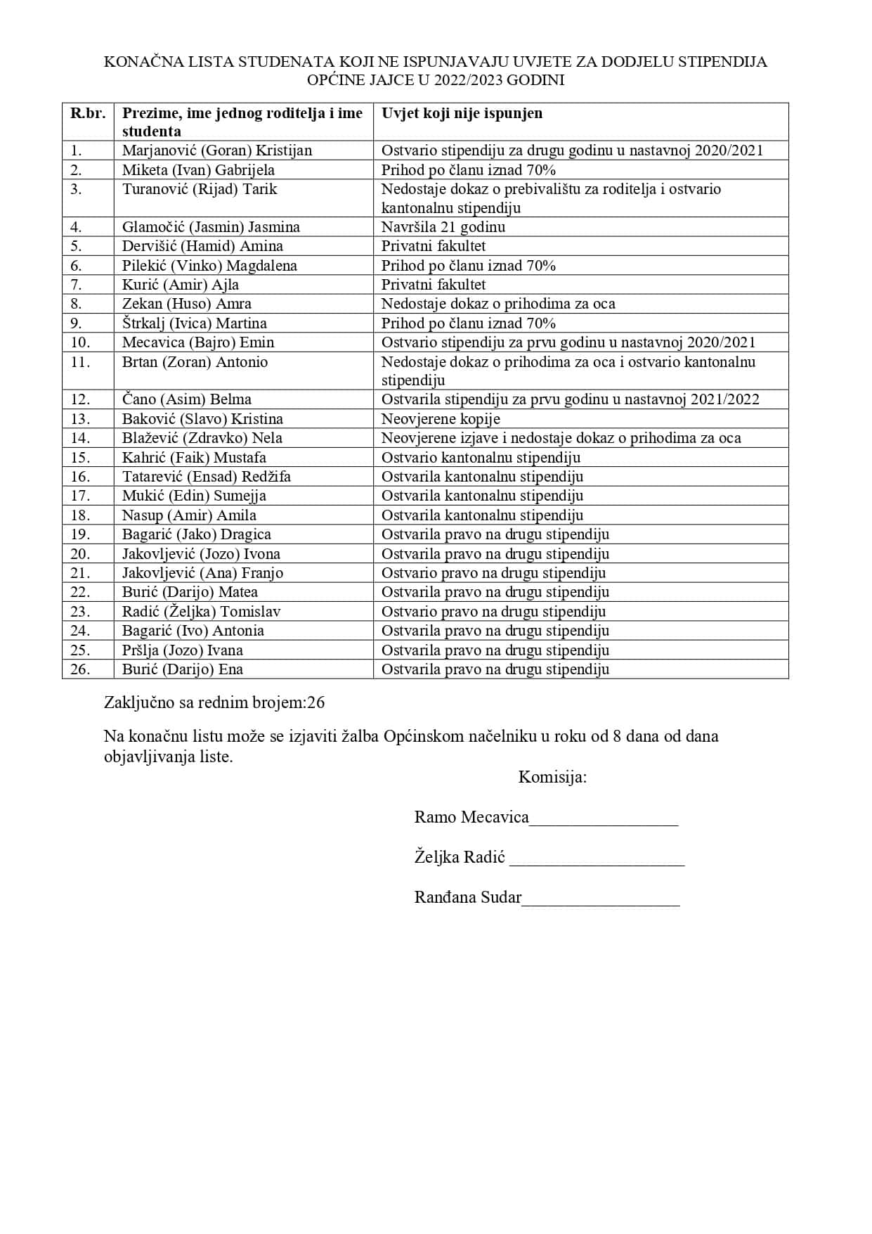 Po okončanju roka za podnošenje prigovora na preliminarne Liste općinska Komisija za dodjelu stipendija utvrdila je Konačne liste za dodjelu stipendija Općine Jajce u 2022/2023. godini.