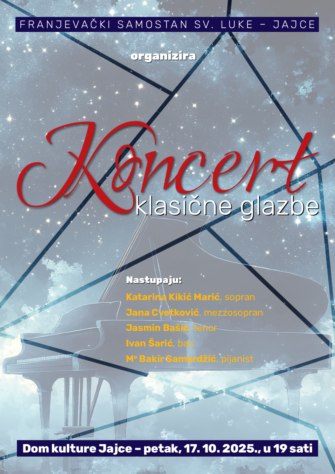 Franjevački samostan sv. Luke u Jajcu organizira ”Koncert klasične glazbe”, koji će se održati u Domu kulture Jajce u petak, 17. listopada 2025. godine, s početkom u 19 sati.