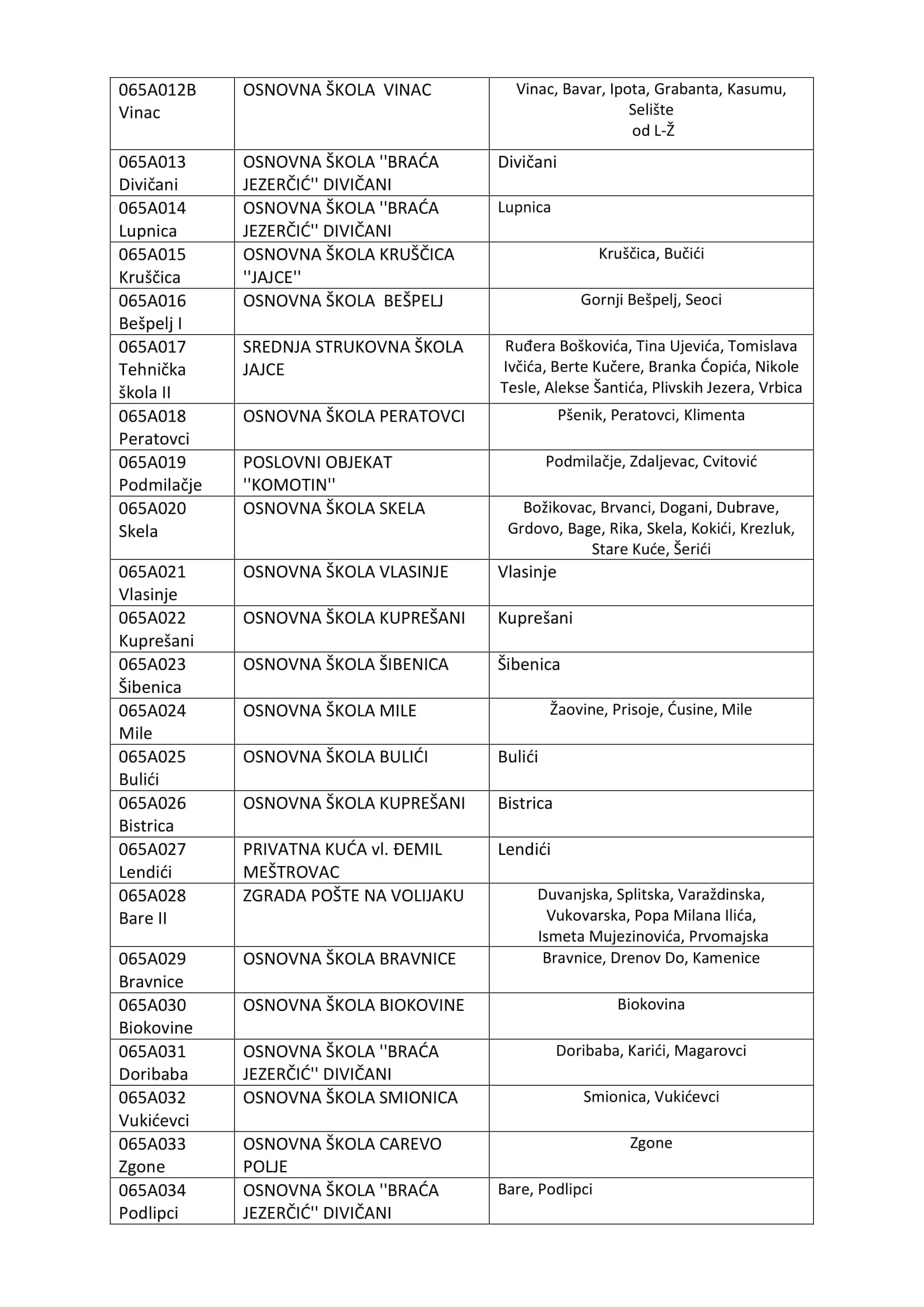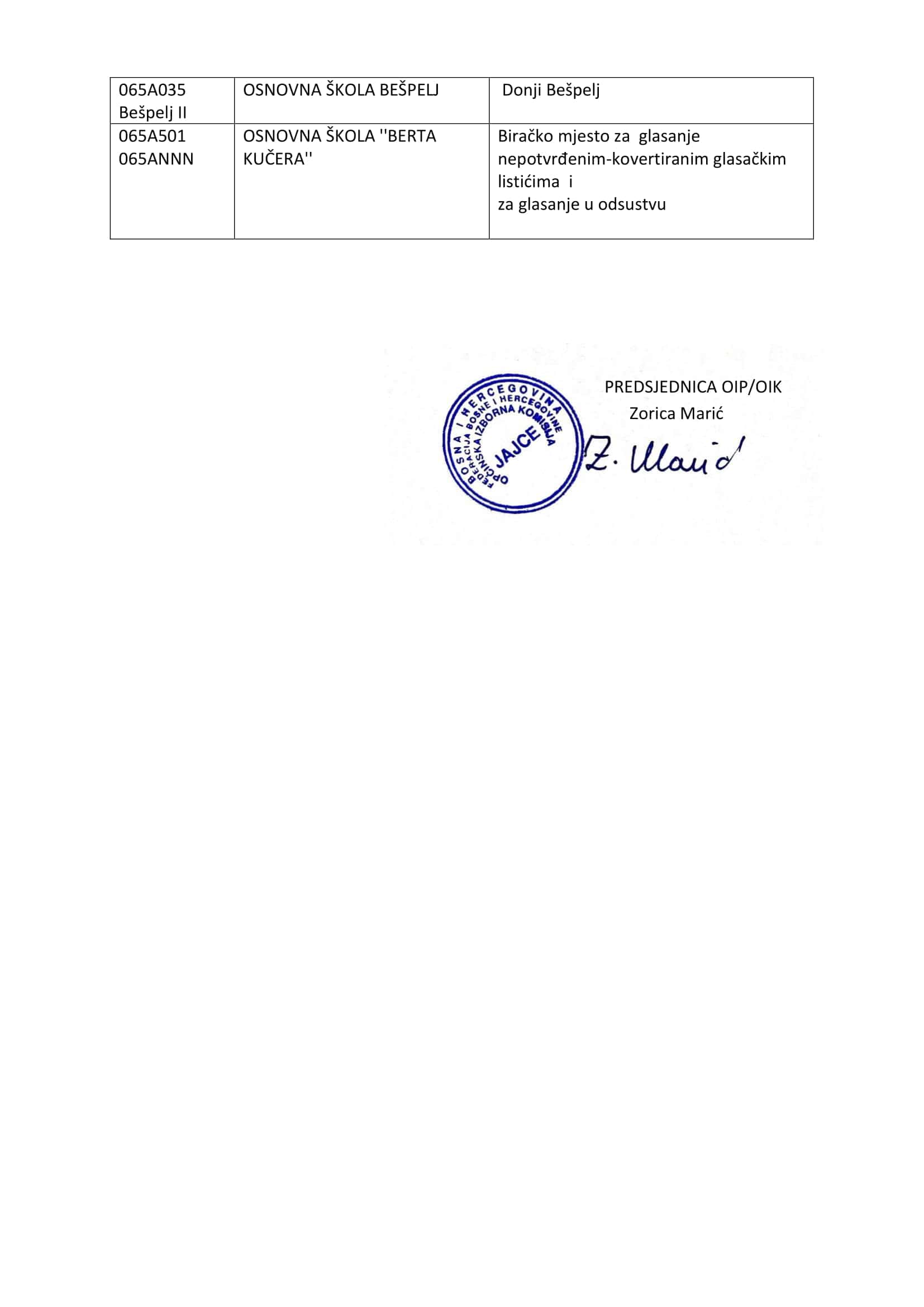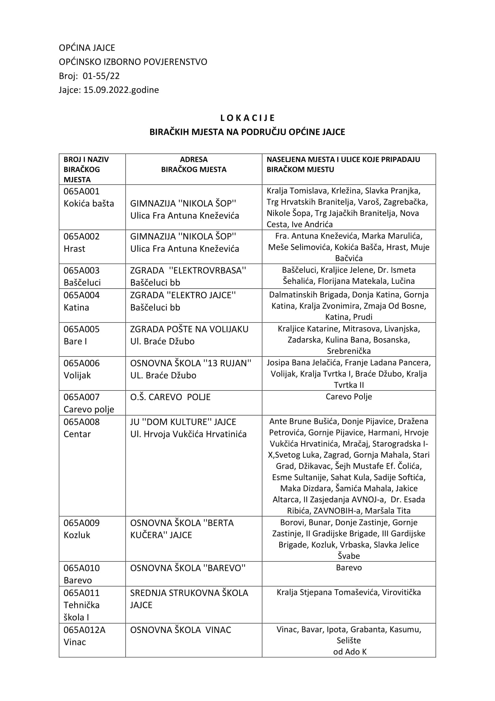 Općinska izborna komisija/povjerenstvo objavljuje Lokacije biračkih mjesta na području općine Jajce (izborna jedinca 065A Jajce).