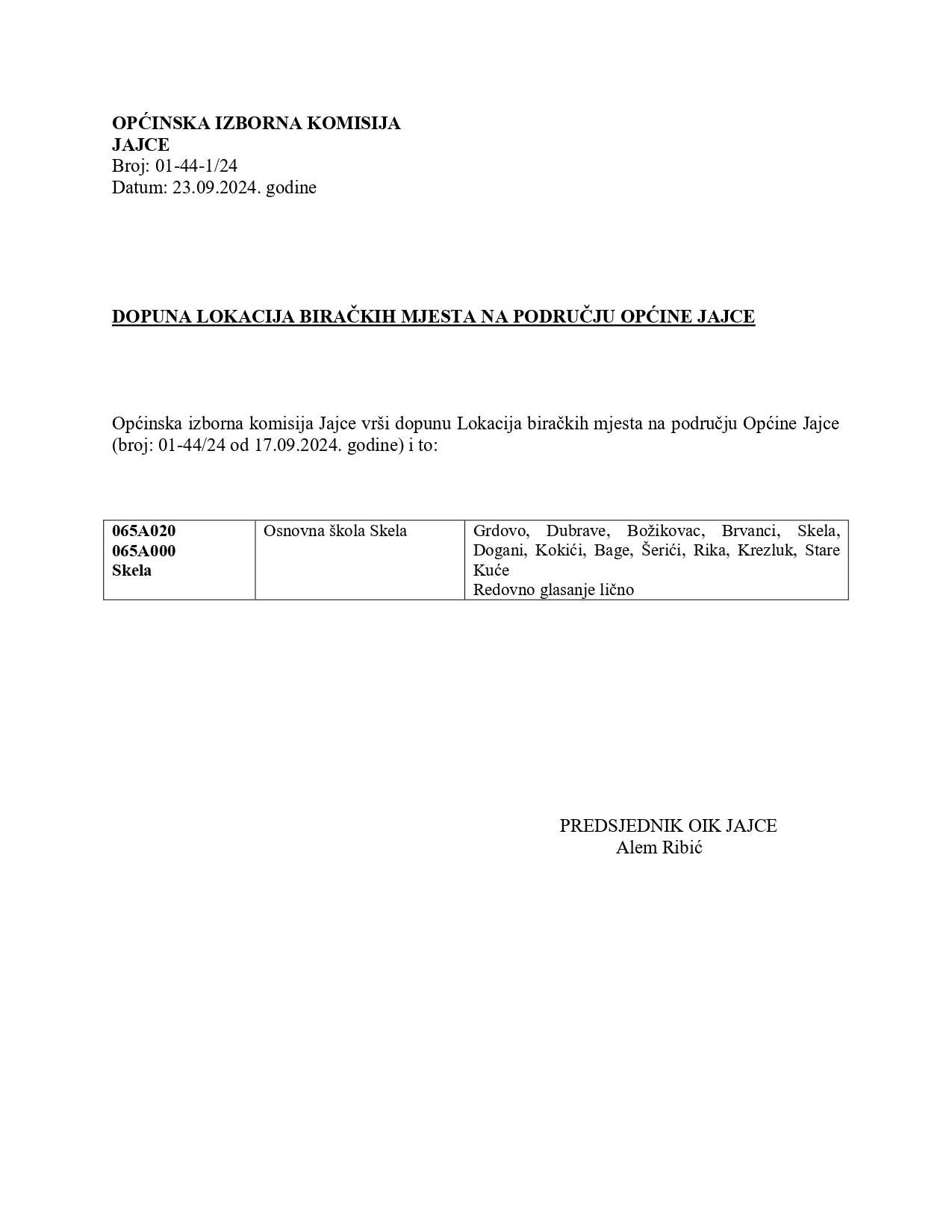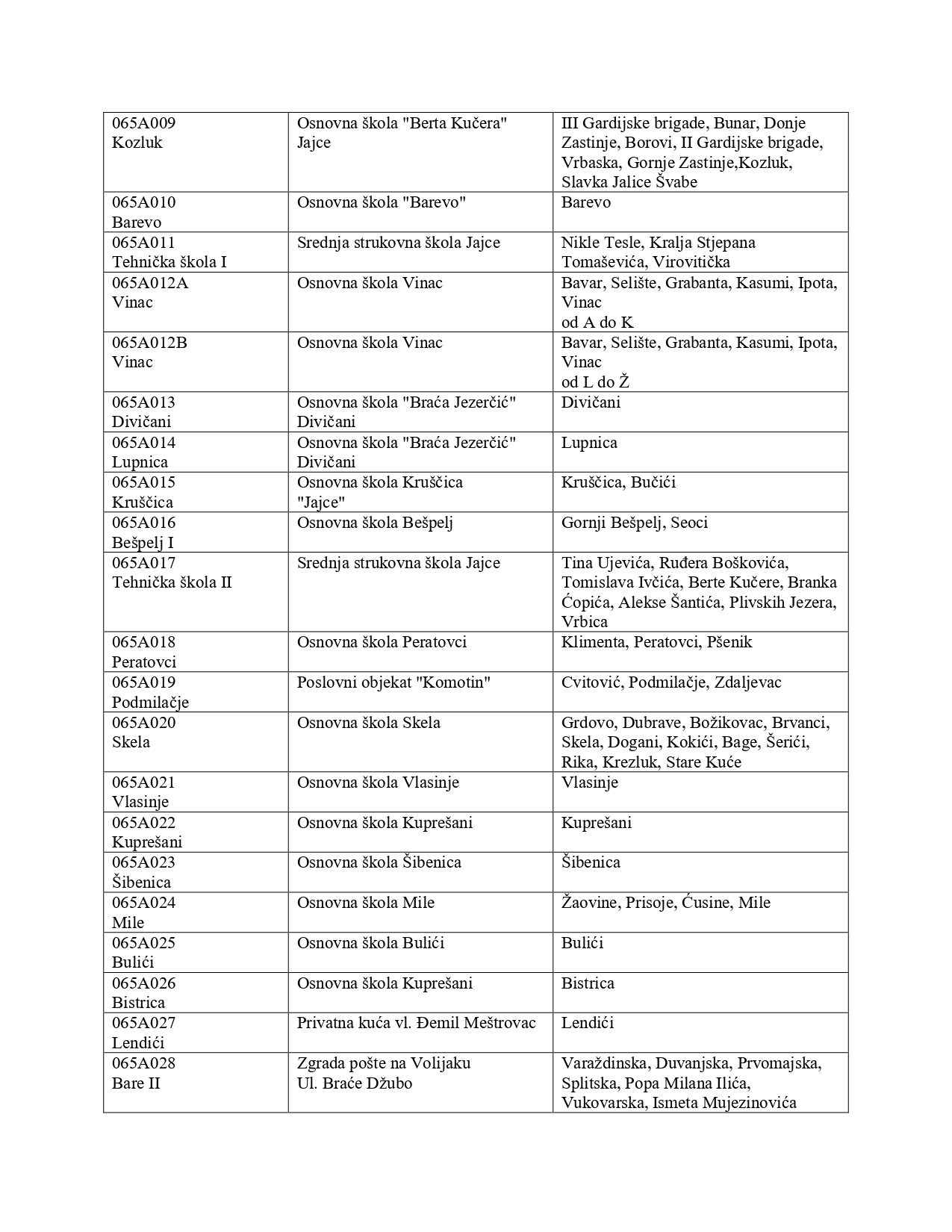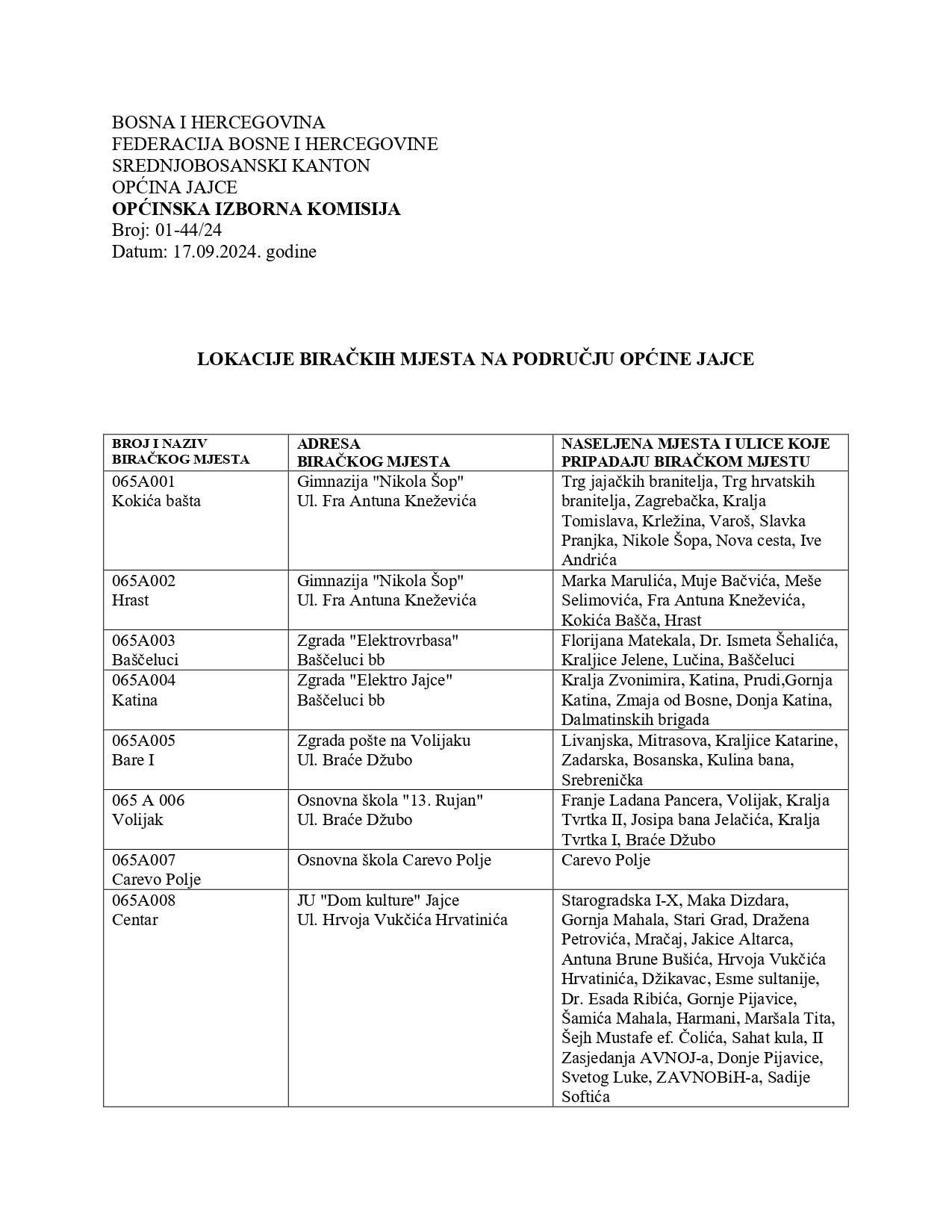 Općinska izborna komisija/povjerenstvo objavljuje Lokacije biračkih mjesta na području općine Jajce (izborna jedinca 065A Jajce).