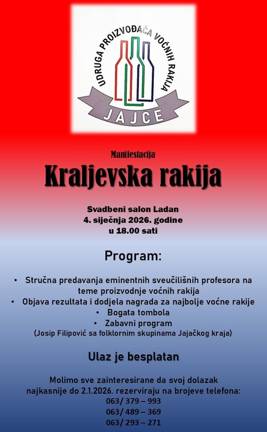 Udruga proizvođača voćnih rakija “Jajce” u ovo doba godine je već po tradiciji posebno aktivna. Već treću godinu za redom organizira se natjecateljsko-edukativna manifestacija “Kraljevska rakija”. Ove godine, središnja svečanost će se održati 4. siječnja u svadbenom salonu Ladan.