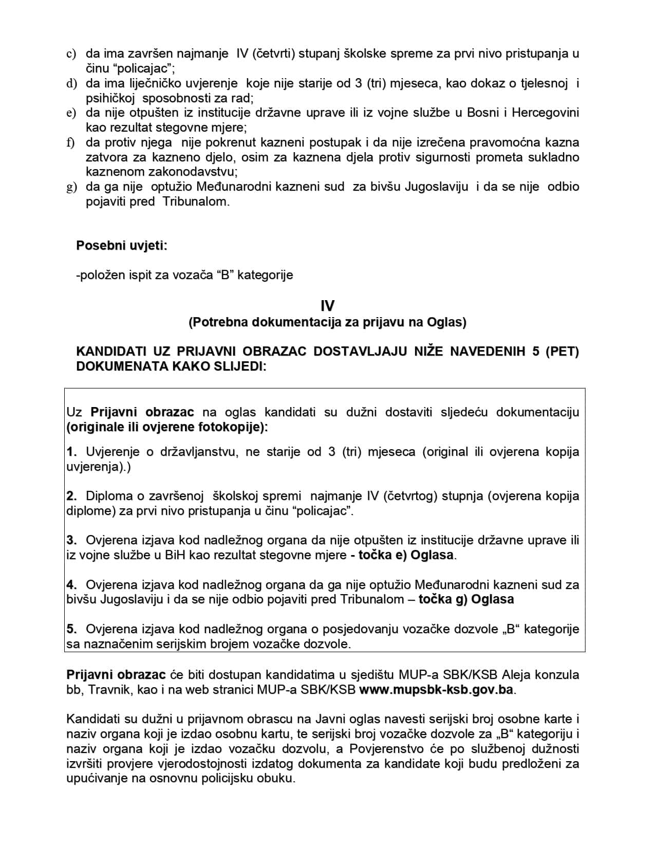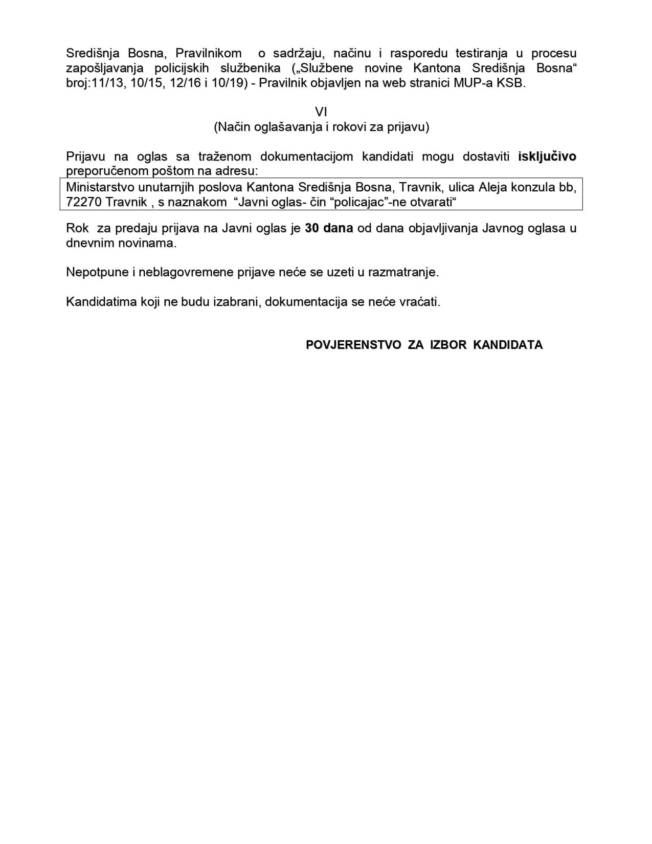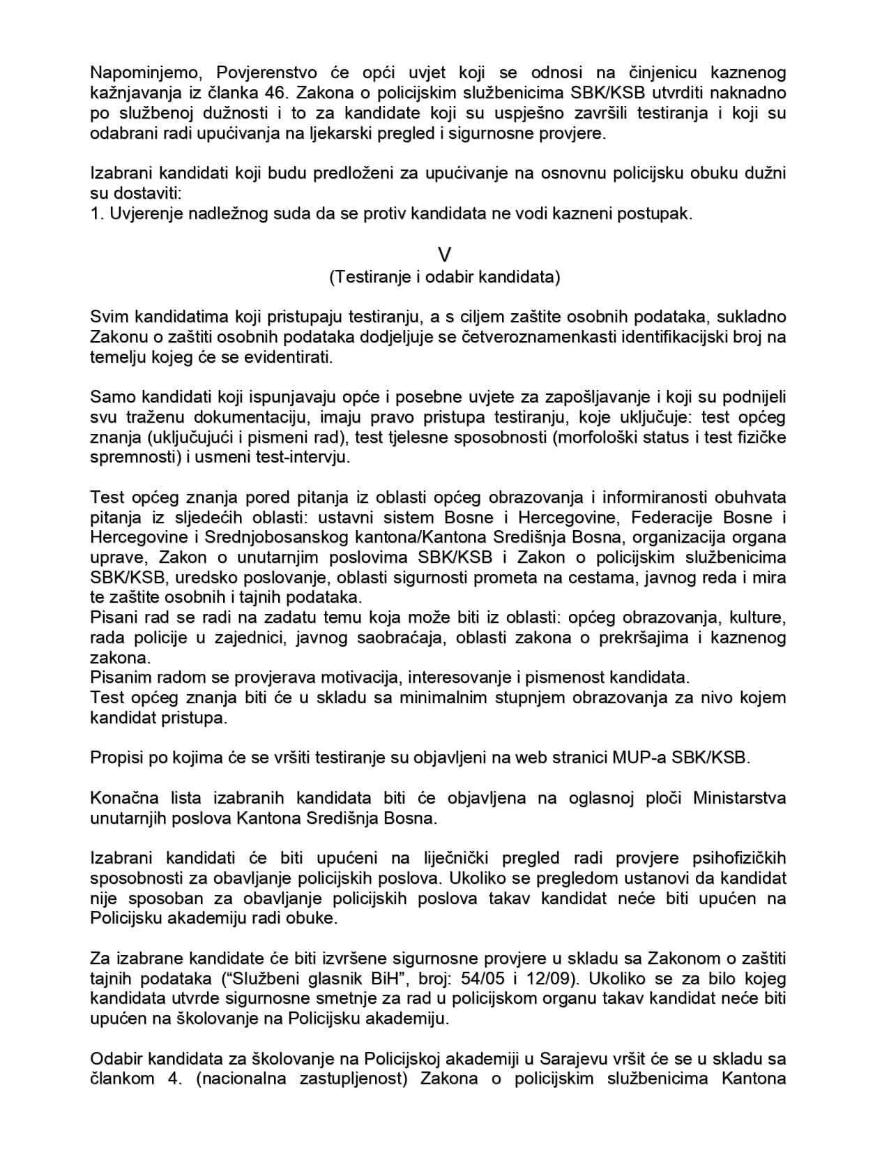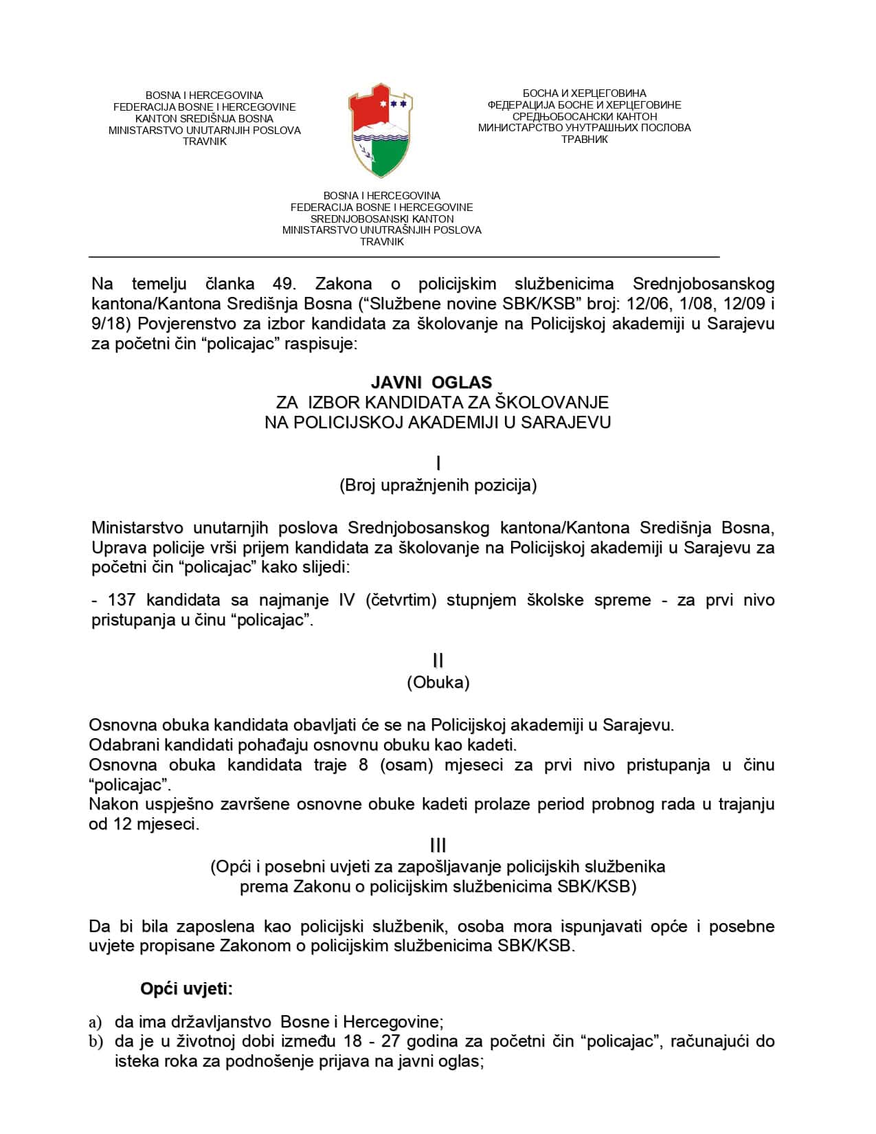 Ministarstvo unutarnjih poslova Kantona Središnja Bosna raspisalo je natječaj za izbor 137 kandidata za školovanje na Policijskoj akademiji u Sarajevu. Rok za prijavu je 30 dana, a integralni tekst natječaja možete pročitati OVDJE javni_oglas_2023 ili na mrežnim stranicama MUP-a