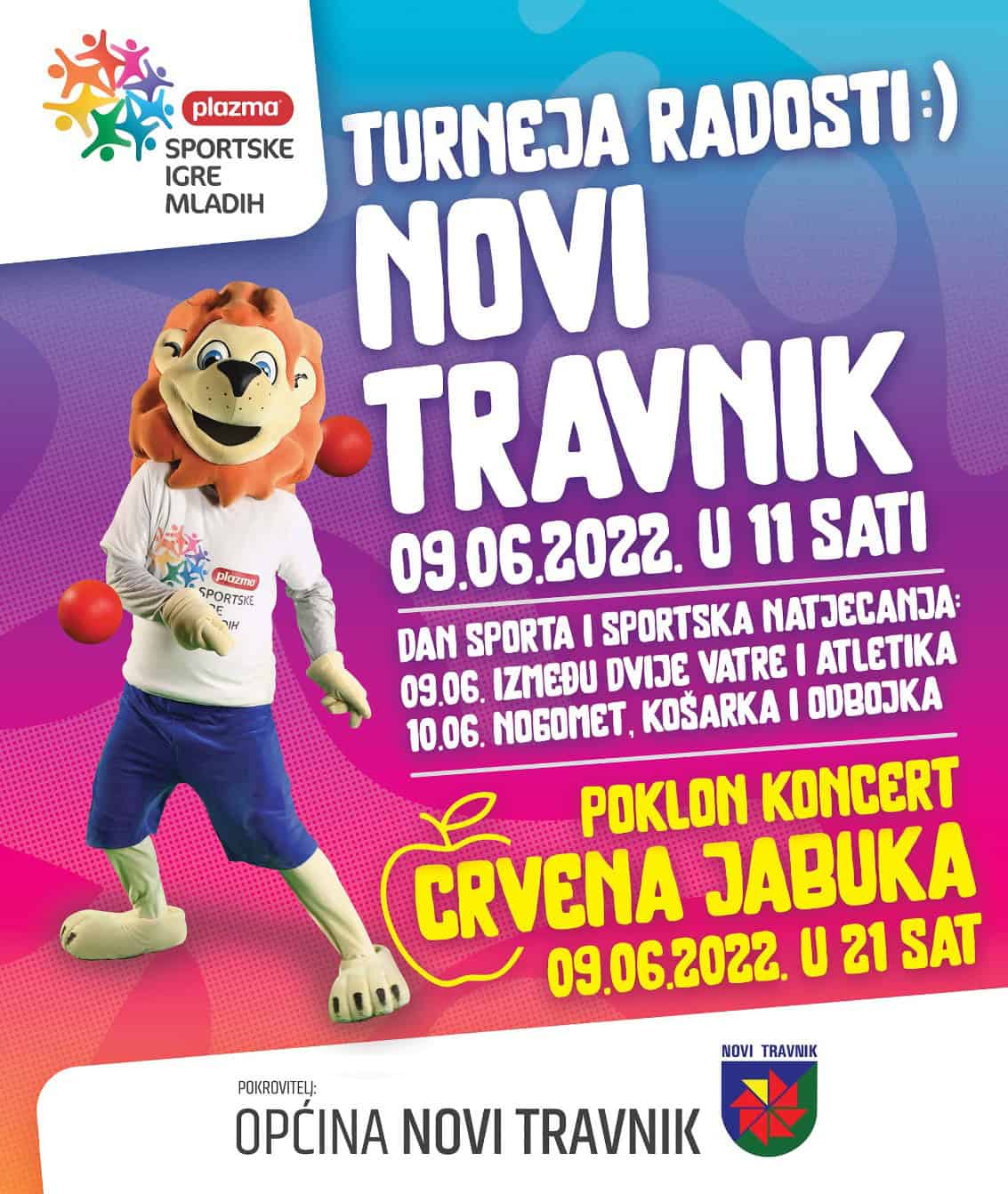 U suradnji sa Općinom Novi Travnik, Plazma Sportske igre mladih Bosne i Hercegovine organiziraju, potpuno besplatno, „Dan sporta“ za učenike Osnovnih škola sa područja Općine i regionalna natjecanja u nogometu, košarci i odbojci te se na ovaj način, Općina Novi Travnik, pridružuje SIM gradovima sporta regije za 2022. godinu uz Rijeku, Zagreb, Čačak, Novi Sad i odabranim gradovima iz BiH. Poseban poklon Općine Novi Travnik za sve generacije posjetitelja biće koncert kultnog bosanskohercegovačkog benda, Crvene Jabuke koji će početi 9.6. u 21h sa spektakularnim vatrometom.