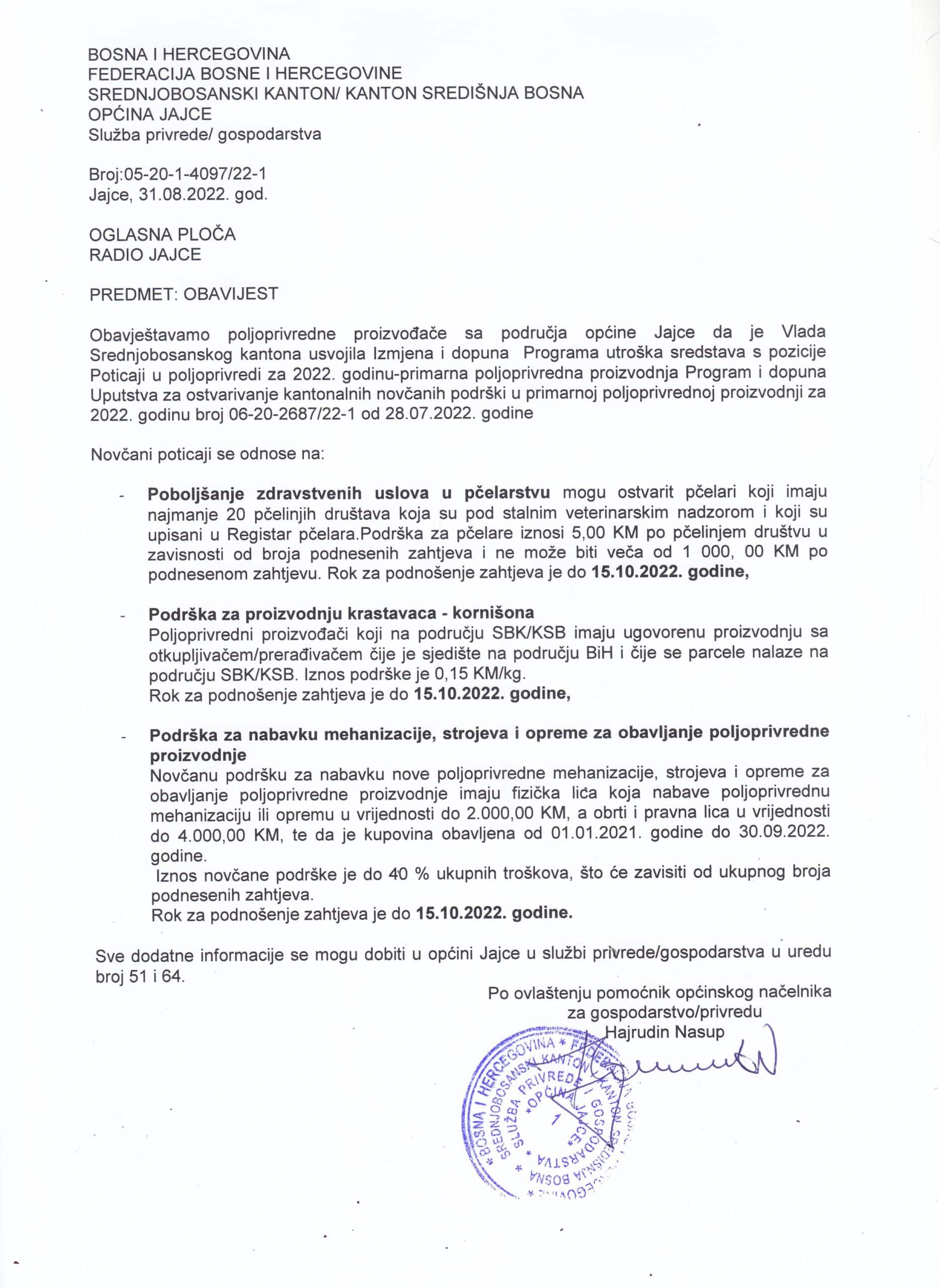 Općina Jajce objavila je odluku Kantonalne Vlade o novim poticajima iz oblasti primarne poljoprivredne proizvodnje: