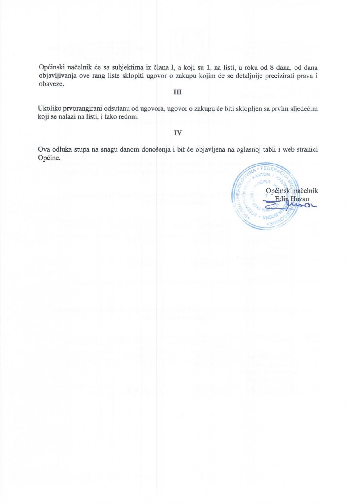 Nakon okončanog Javnog konkursa za dodjelu poslovnih prostora u zakup, te na osnovu Preliminarne rang liste utvrđene od strane Komisije, Općinski načelnik donio je Odluku o konačnoj listi za dodjelu poslovnih prostora u zakup.