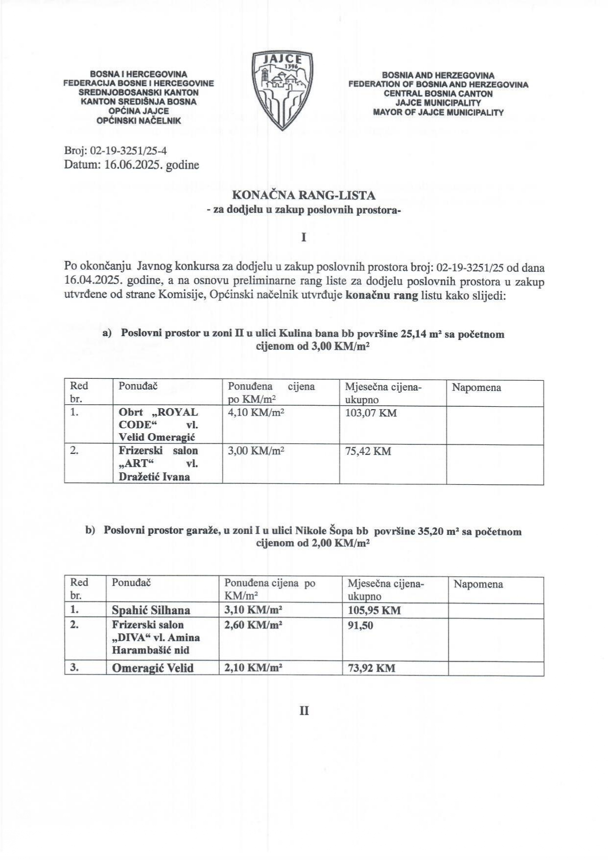 Nakon okončanog Javnog konkursa za dodjelu poslovnih prostora u zakup, te na osnovu Preliminarne rang liste utvrđene od strane Komisije, Općinski načelnik donio je Odluku o konačnoj listi za dodjelu poslovnih prostora u zakup.