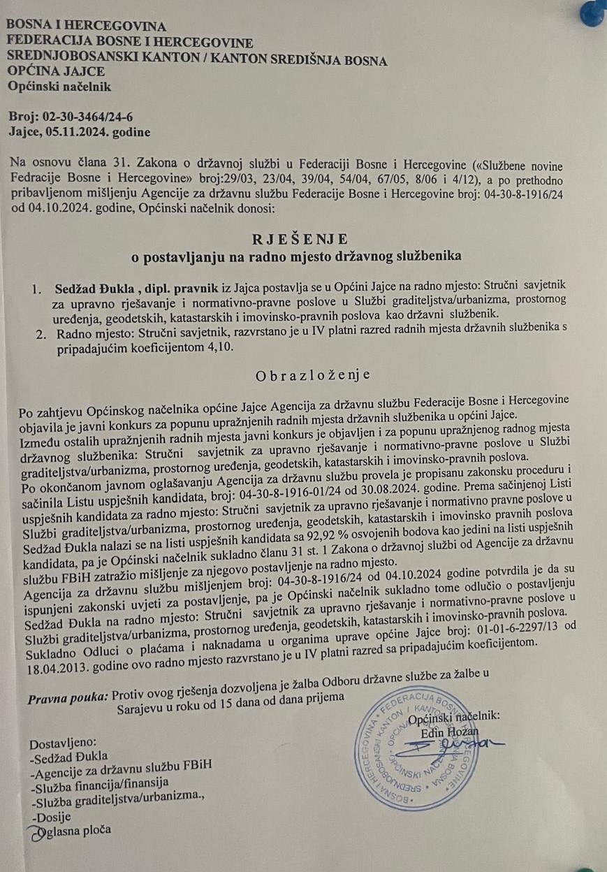 Na oglasnoj ploči općine Jajce ovih se dana mogu pročitati rješenja o postavljanju 5 novih uposlenika.