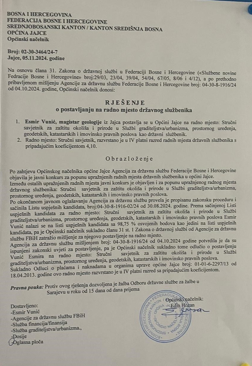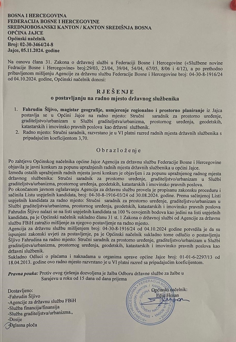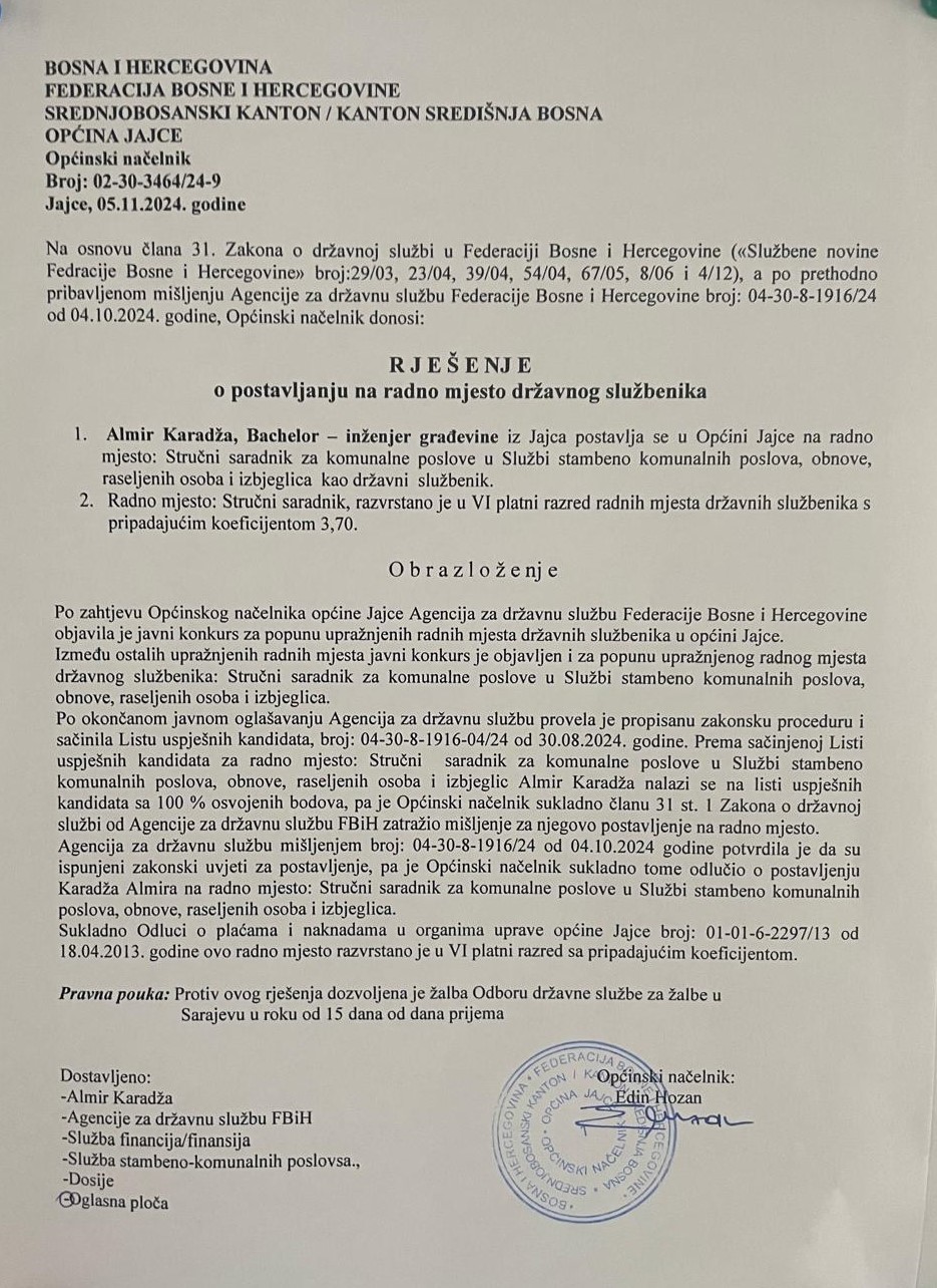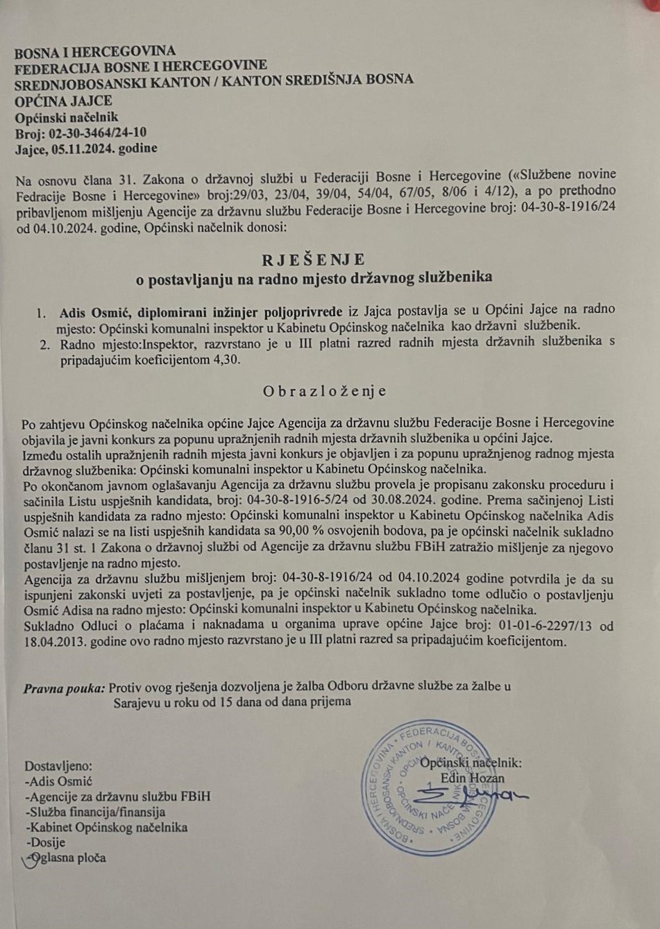 Na oglasnoj ploči općine Jajce ovih se dana mogu pročitati rješenja o postavljanju 5 novih uposlenika.