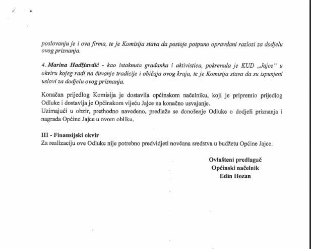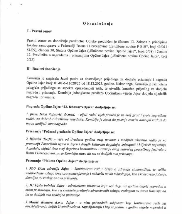 Na 6. redovitoj sjednici općine Jajce saopćena je i konačna lista nagrađenih pojedinaca, organizacija i poduzeća.