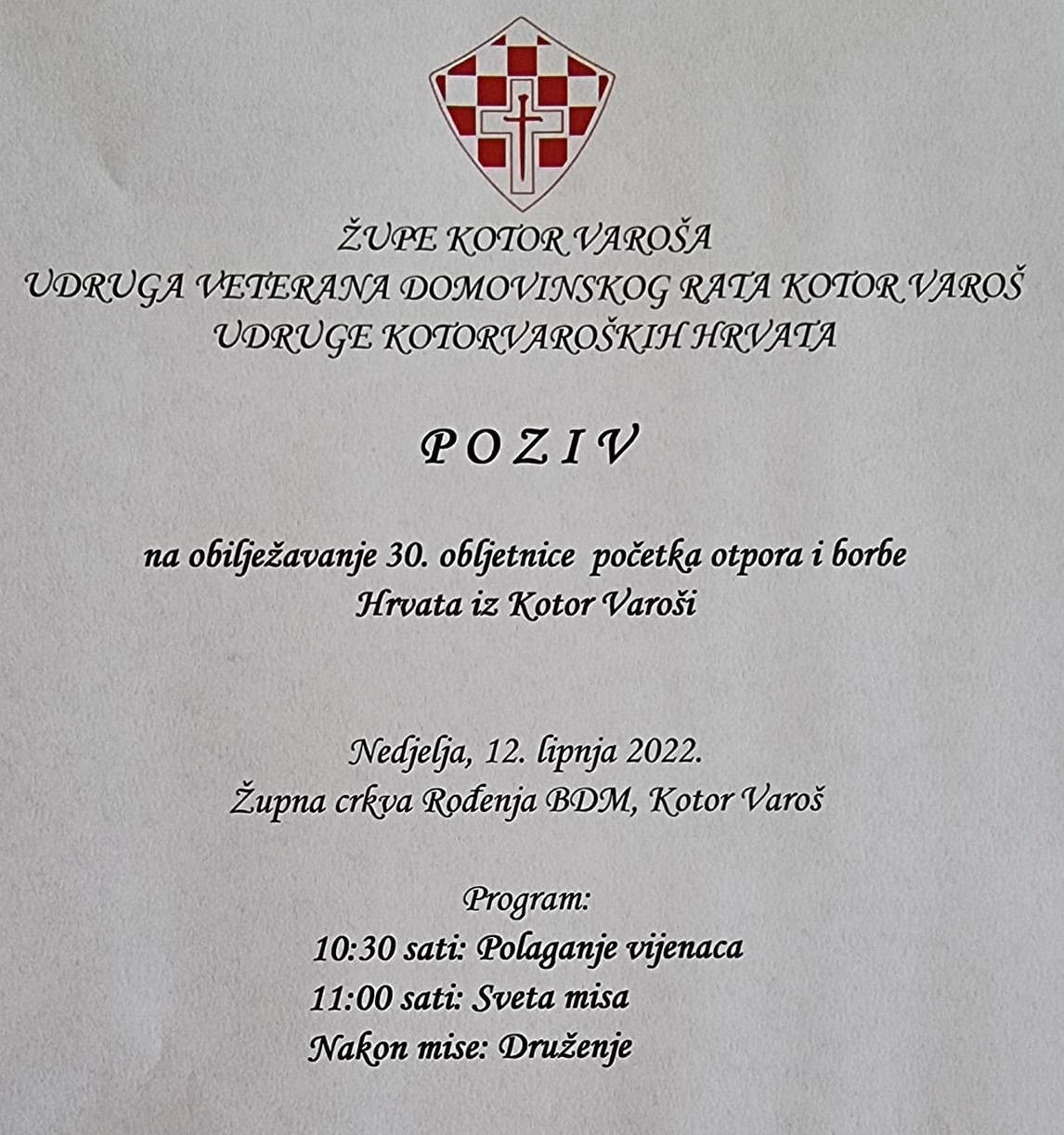 U nedjelju 12. lipnja će su u Kotor Varoši obilježiti 30. obljetnica od početka otpora i borbe Hrvata kotorvaroškog kraja. Svečanost u organizaciji župa Kotor Varoši, Udruge veterana domovinskog rata Kotor Varoš i Udruge kotorvaroških Hrvata započinje u 10.30 polaganjem vijenaca a nastavlja Svetom misom u 11 sati. Nakon mise je planirano druženje za goste i domaćine.