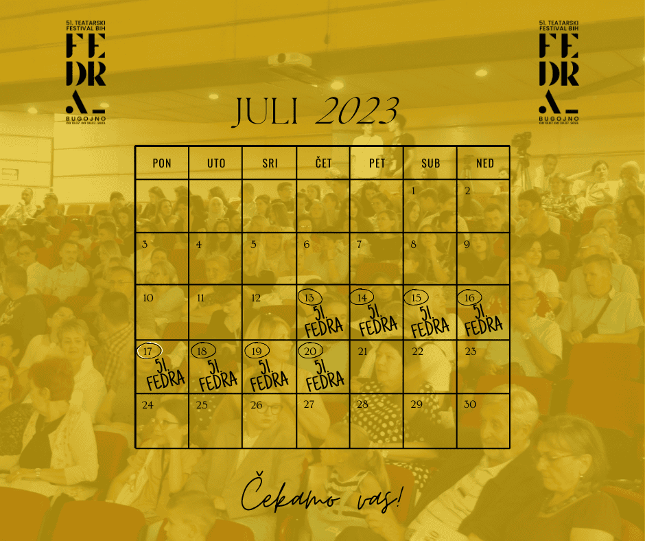 U malom teatarskom gradu, Bugojnu, uveliko se priprema ovogodišnje izdanje najstarijeg festivala amaterskih pozorišta, 51. Teatarski festival BiH FEDRA, koji će se tradicionalno održati od 13. do 20. jula. Kao i svake godine, vrijedni teatarski entuzijasti kako iz Bugojna tako i iz cijele Bosne i Hercegovine, pripremili su sedmicu dana teatarske i umjetničke čarolije i igre koja će predstaviti najbolja ovogodišnja dostignuća amaterske teatarske scene. Stručni žiri čine Božana Bijelić (prvakinja Dječijeg pozorišta Republike Srpke), Dženita Imamović Omerović (docentica na predmetu Gluma na Akademiji scenskih umjetnosti u Sarajevu) i Adrijana Gavrić (producentica i prezenterka emisije “Scena” na N1 televiziji.)