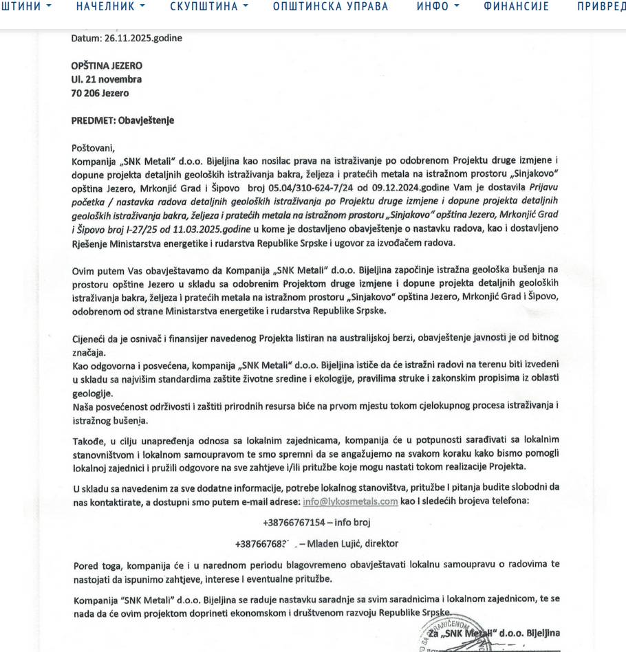 “Yugo Metals Limited” je također na društvenim mrežama objavio da su strojevi stigli, te da su završili pripreme za bušenje na lokaciji Sinjakovo u potrazi za zlatom. Navode da će bušenje trajati do kraja ove godine, a da će početni rezultati biti objavljeni 2026. godine.
