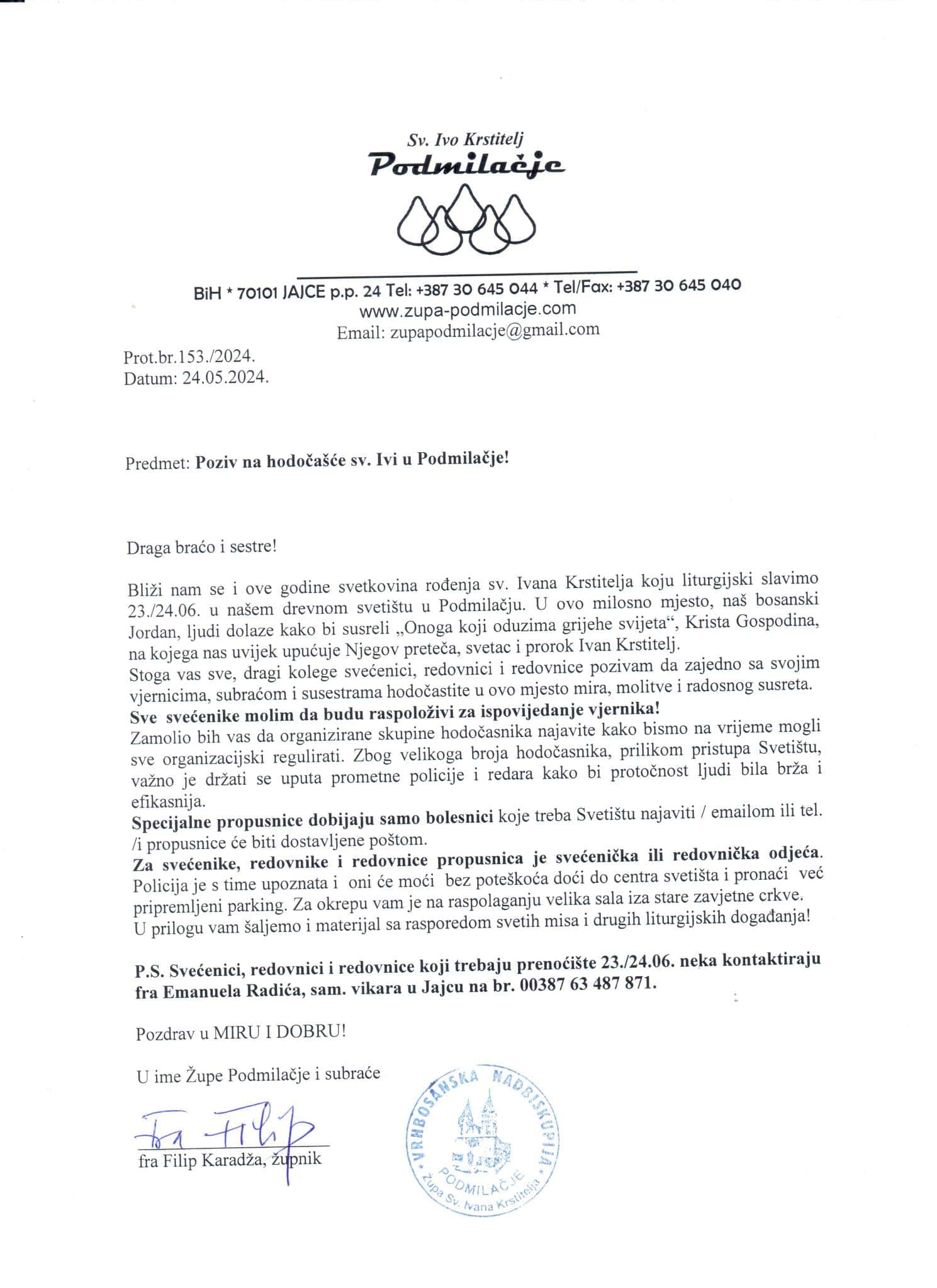 Župa Podmilačje i svetište Svetog Ivana krstitelja objavila je program molitvenog sadržaja i izdala poziv i proglas hodočasnicima, svećenicima i sestrama koji ove godine dolaze hodočaste ovom velikom svetištu.