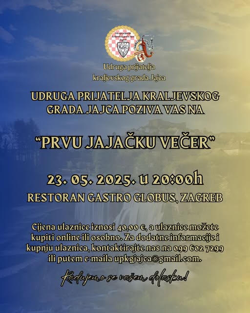 Udruga prijatelja kraljevskog grada Jajca s velikim veseljem najavljuje organizaciju Prve Jajačke večeri, koja će se održati 23. svibnja 2025. u Restoranu Gastro Globus u Zagrebu!