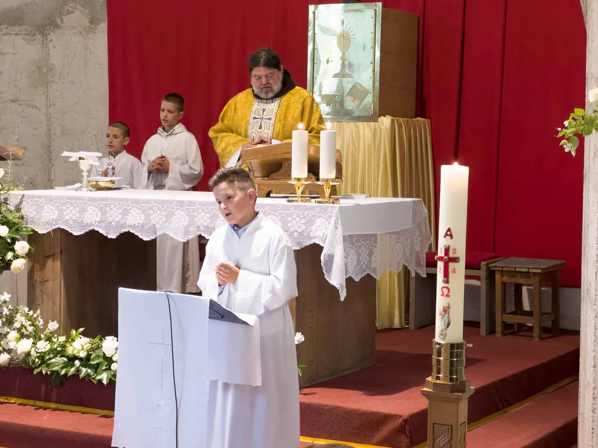 Danas, već zarana, prvopričesnici su sa roditeljima počeli pristizati u Dolinu svetog Ive. Pola sata prije početka svete Mise, oni su se u zavjetnoj crkvi poredali uz pomoć s. Dragice Ljubos i s. Gizele Dolić, koje su djecu više mjeseci spremale za ovaj svečani događaj. Po svečanom ulasku u kriptu, prvopričesnici su najprije uz pratnju župnog zbora otpjevali pjesmu, a zatim su izrecitirali nekoliko stihova koje su pripremili za ovu svečanost, a dvoje od roditelja izrecitirali su stihove prigodne ovoj svečanosti. Zatim je uslijedila sveta Misa, koju je predvodio fra Filip Karadža, župnik – a u kojoj su prvopričesnici bili uključeni, tako da je ova sveta Misa za sve vjernike bila nešto posebno. Prvopričesnici su sa roditeljima spremili misna čitanja, molitvu vjernika i također su prinijeli darove na oltar. Ovo je uistinu bio njihov dan! Bilo je divno promatrati njihova nevina, dječja lica dok su palili svoje prvopričesničke svijeće i radovali se Kristovom svjetlu koje je ovoga dana na poseban način obasjavalo njihov život. Najsvečaniji dio svete Mise bio je trenutak kada su prvopričesnici stupili ispred oltara, gdje im je prvi put podijeljena Sveta pričest. Dok su u svoje tijelo primali Kristovo tijelo na njihovim licima mogla se čitati dječja radost, pobožnost, strahopoštovanje i predanje Isusu.