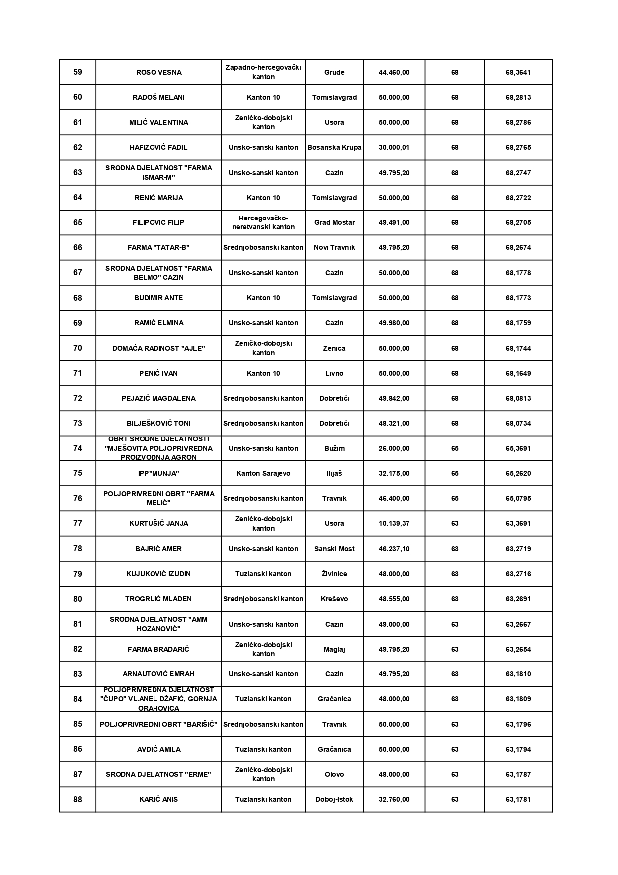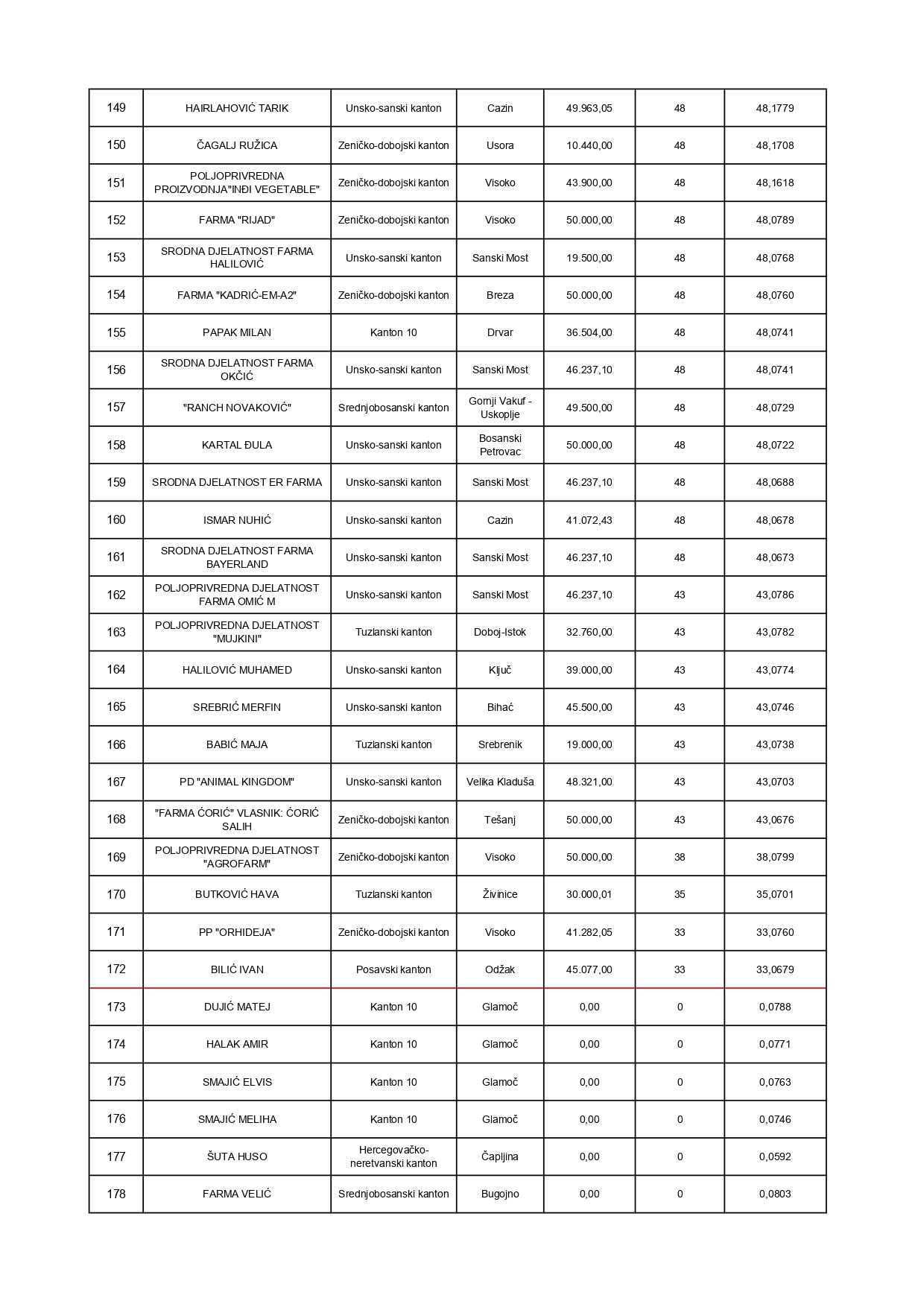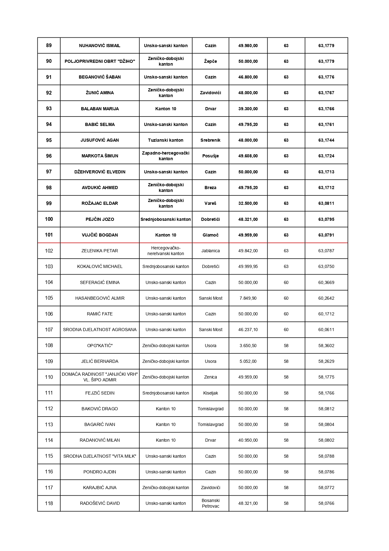 - Klijenti koji su rangirani pod rednim brojevima od 102 do 172 su klijenti čiji su zahtjevi potpuni, ali ne mogu biti isplaćeni zbog nedostatka sredstava planiranih Programom podrške u okviru ove mjere;