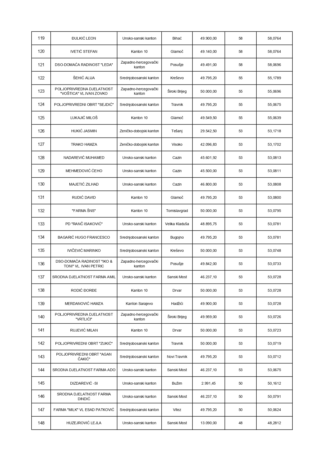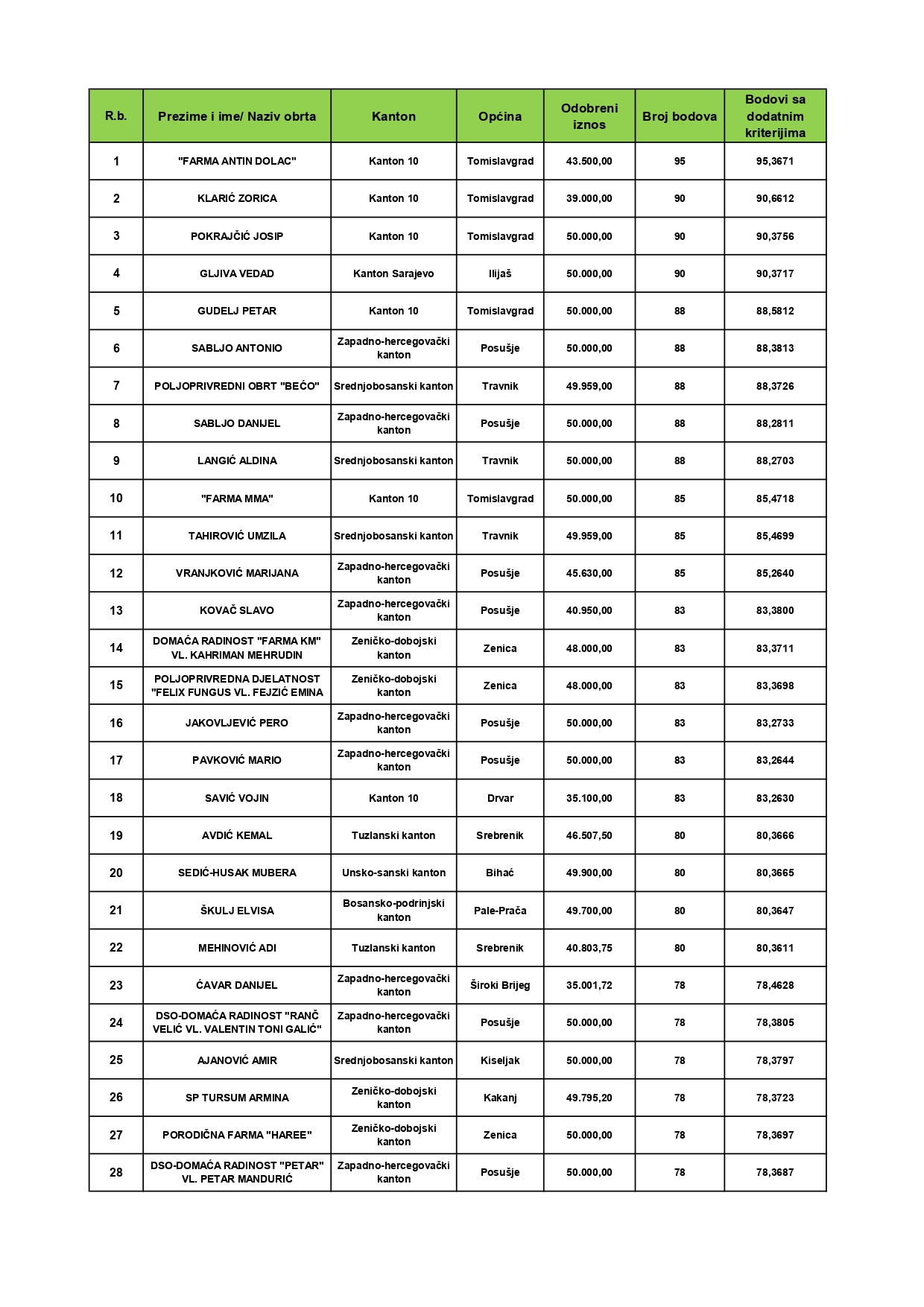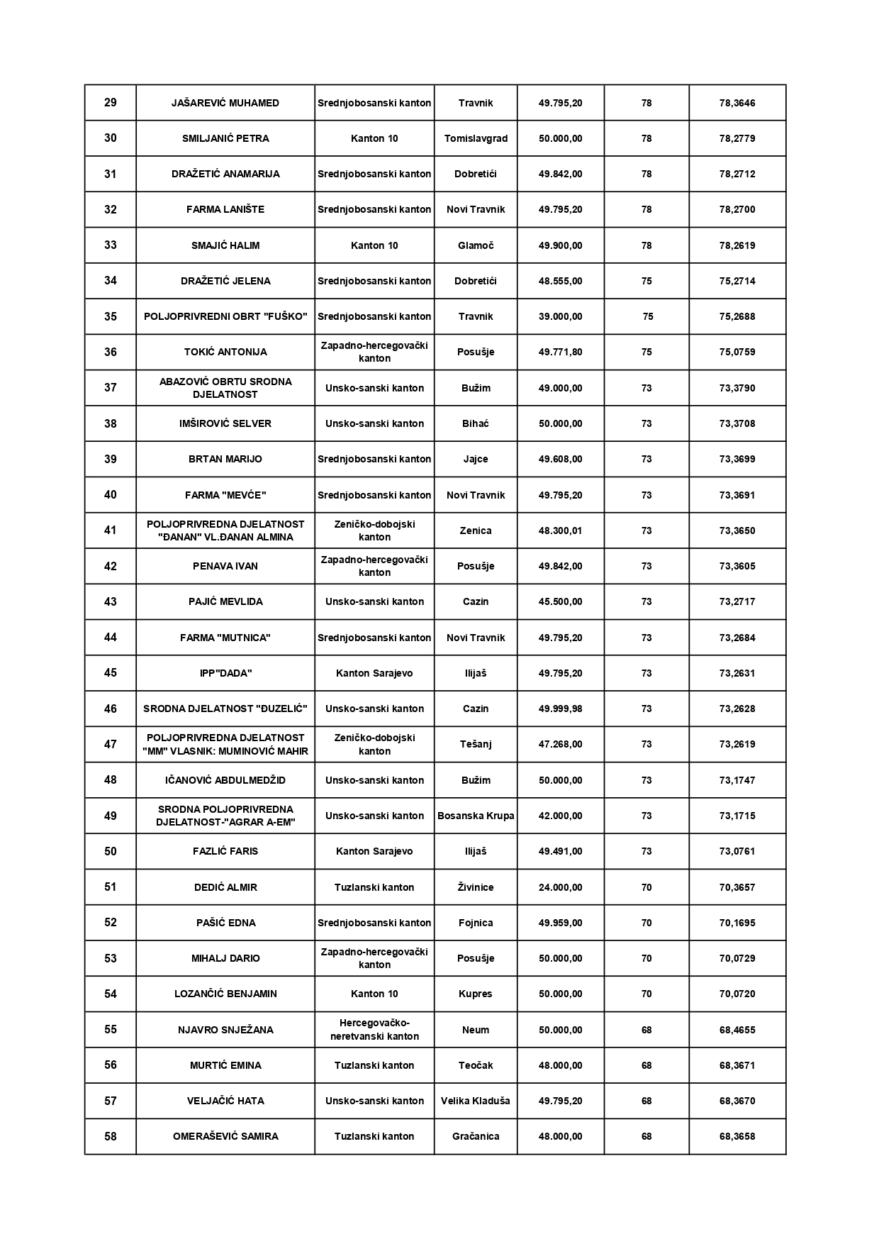 - Klijenti koji su rangirani pod rednim brojevima od 102 do 172 su klijenti čiji su zahtjevi potpuni, ali ne mogu biti isplaćeni zbog nedostatka sredstava planiranih Programom podrške u okviru ove mjere;