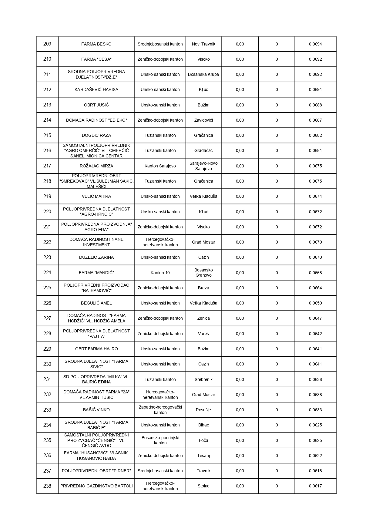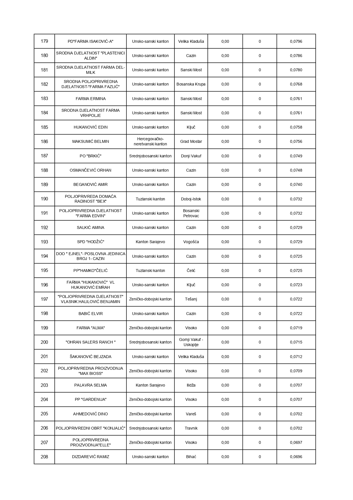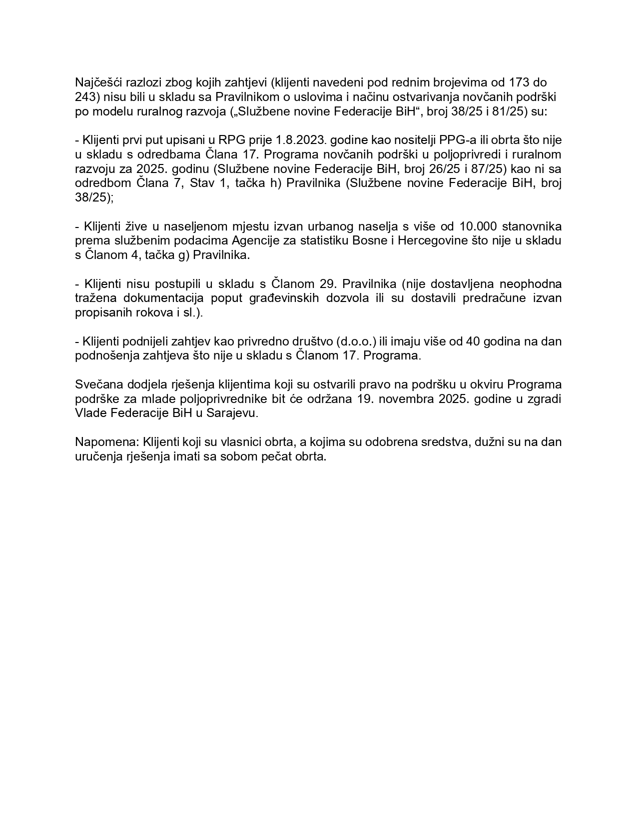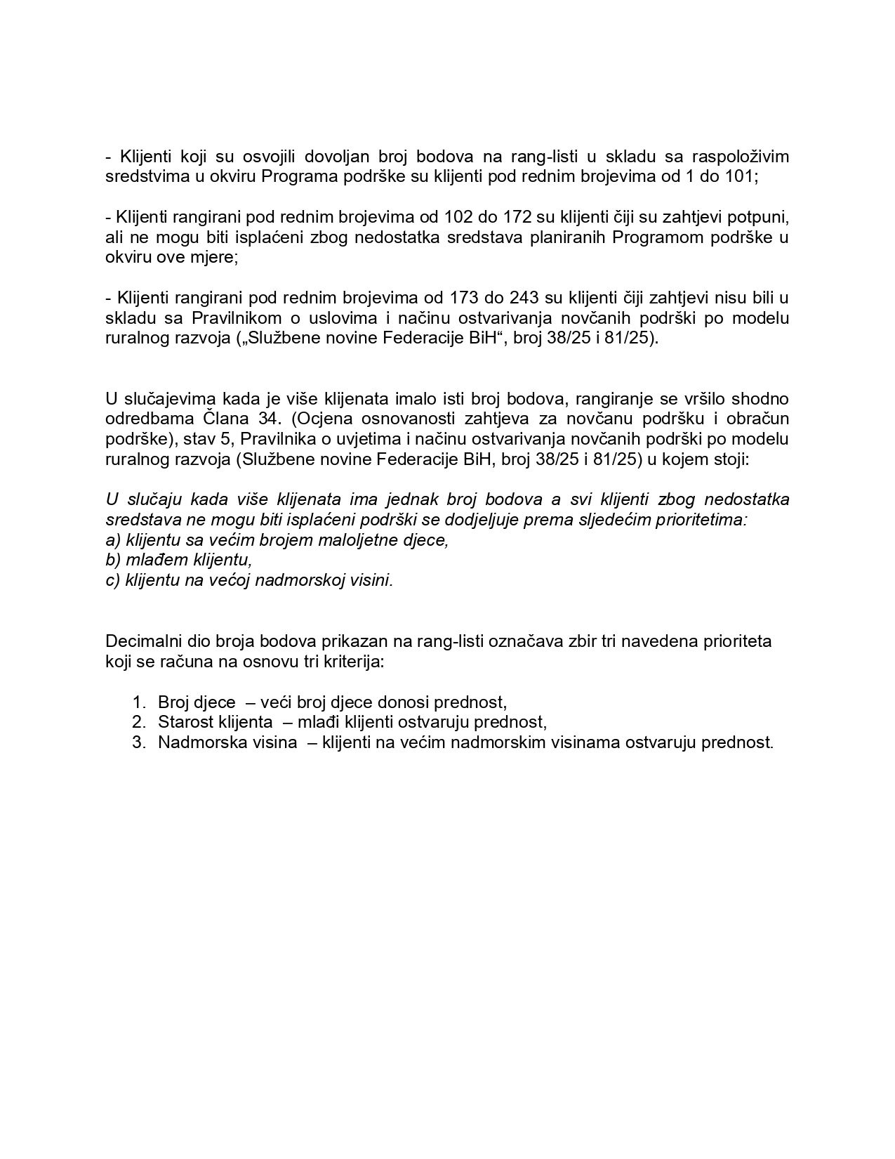 - Klijenti koji su rangirani pod rednim brojevima od 173 do 243 su klijenti čiji zahtjevi nisu bili u skladu sa Pravilnikom o uslovima i načinu ostvarivanja novčanih podrški po modelu ruralnog razvoja („Službene novine Federacije BiH“, broj 38/25 i 81/25).