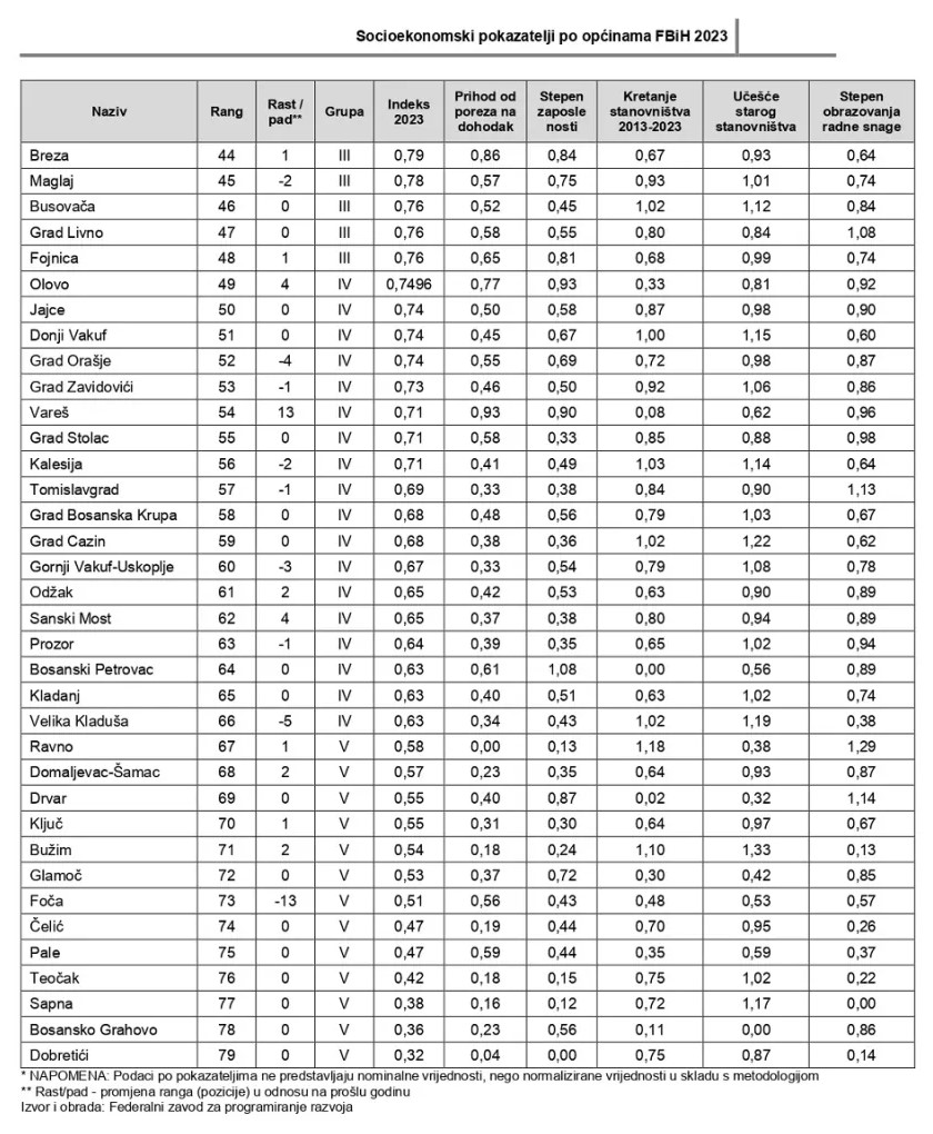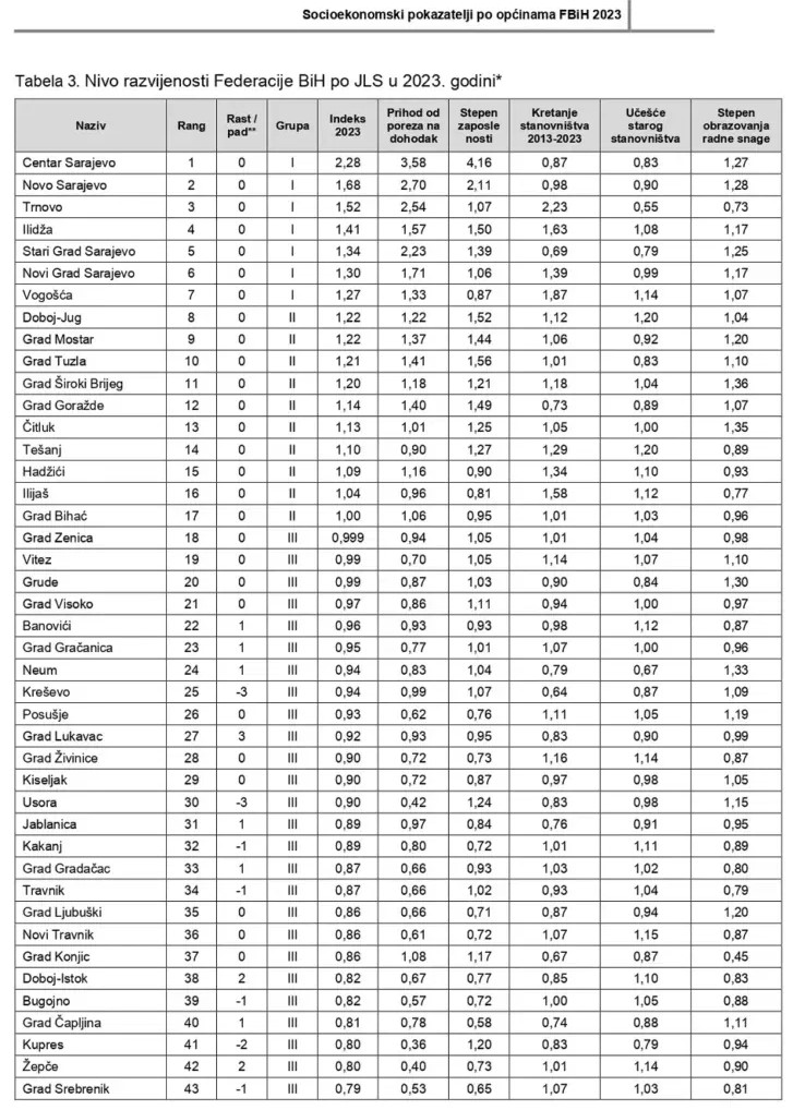 Federalni zavod za programiranje razvoja izradio je dokument u kojem su općine i gradovi u FBiH rangirani po razvijenosti.