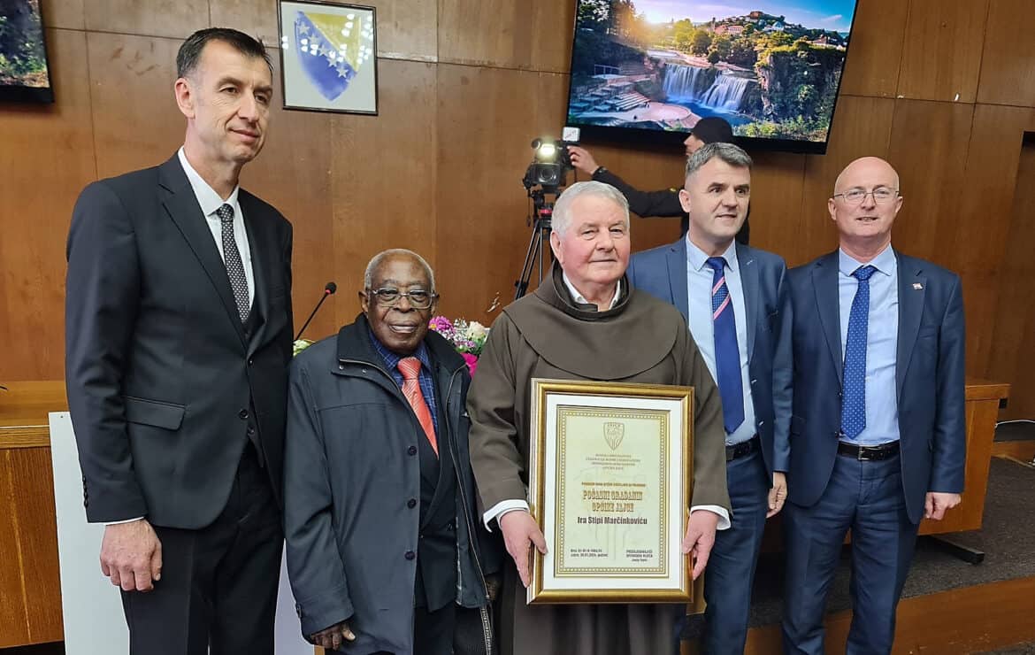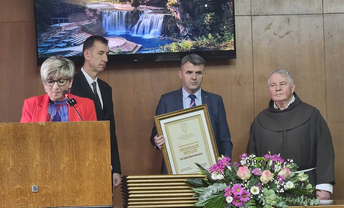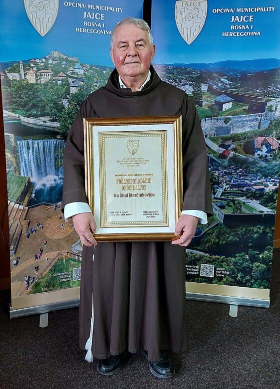 Priznanje Počasni građanin Općine Jajce uručili su fra Stipi Marčinkoviću predsjednik Općinskog vijeća Jajce Josip Topić i načelnik Općine Jajce Edin Hozan na svečanoj sjednici Općinskog vijeća Jajca na Dan Općine Jajce, u četvrtak 22. veljače 2024. godine.