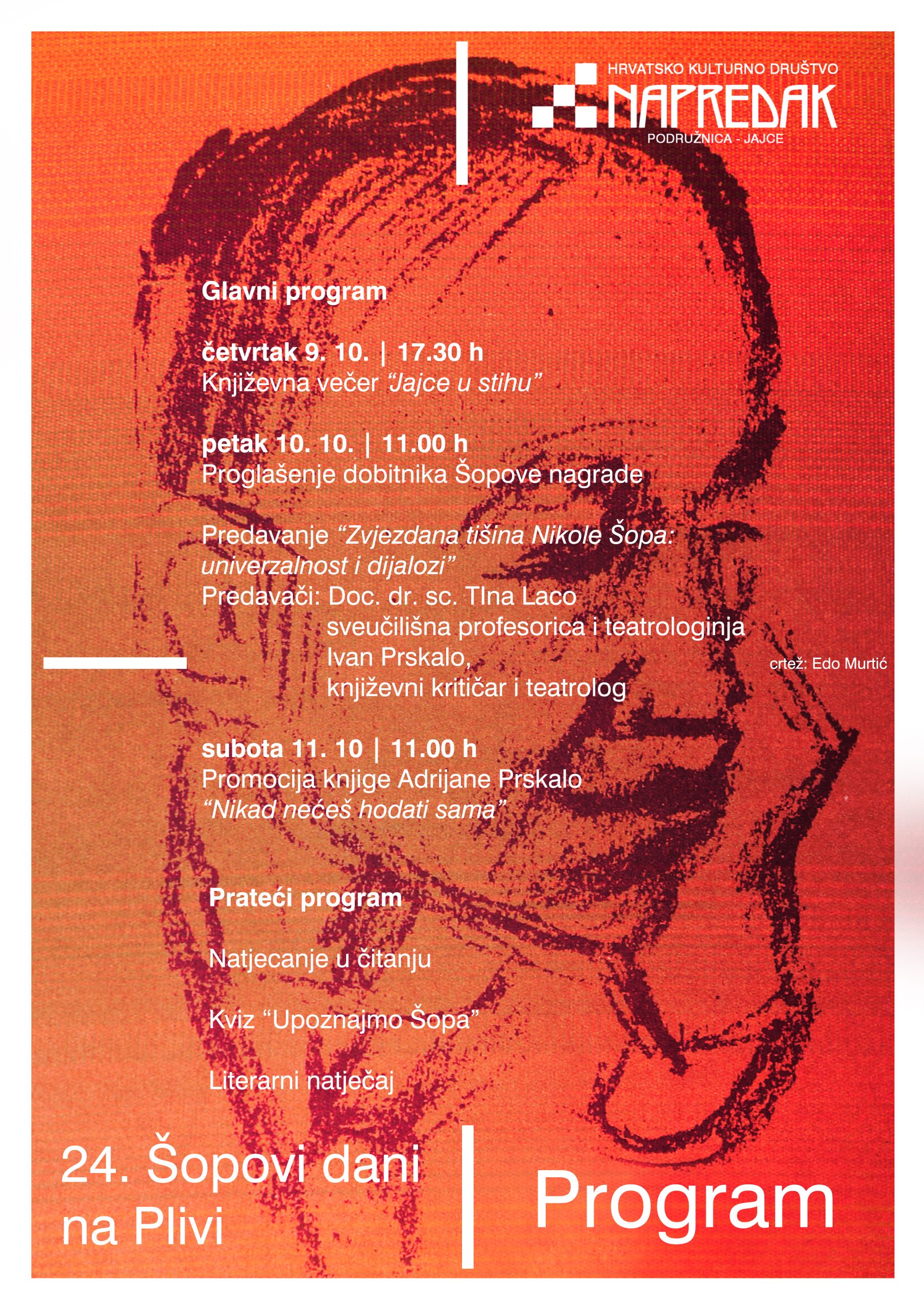 Tradicionalna književna manifestacija „24. Šopovi dani na Plivi“ bit će održana u Jajcu od 9. do 11. listopada 2025. godine, okupljajući pjesnike, književnike, kritičare i ljubitelje pisane riječi u čast velikog pjesnika Nikole Šopa.