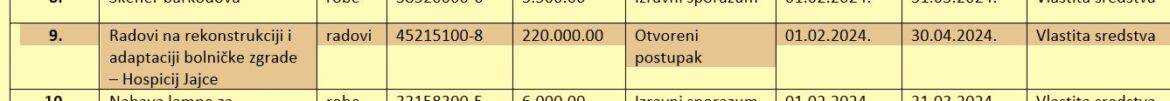 Provjerom na spisku javnih nabavki JU Opća bolnica Jajce vidljivo je da je natječaj za radove na zgradi hospicija traje od 01.02.-30.04. godine