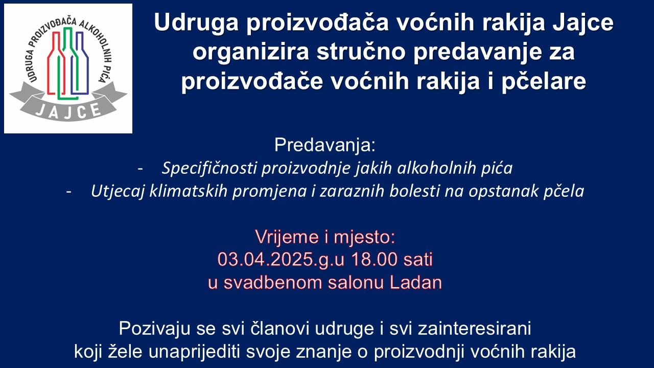 Udruga proizvođača voćnih rakija “Jajce” organizira stručna predavanja na temu proizvodnje rakija, tretiranja voćnjaka i bolesti pčela.