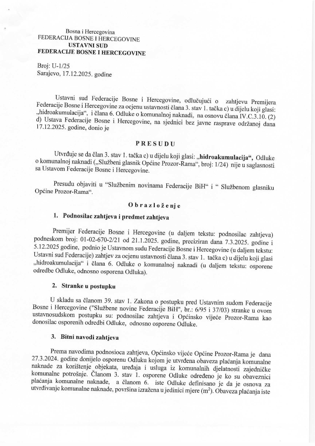 Ustavni sud F BiH dostavio je 28.12026. godine Općini Prozor – Rama presudu kojom je, po ranijem zahtjevu premijera FBiH, Nermina Nikšića, dio Odluke o komunalnoj naknadi Općine Prozor – Rama ocijenio neustavnom.