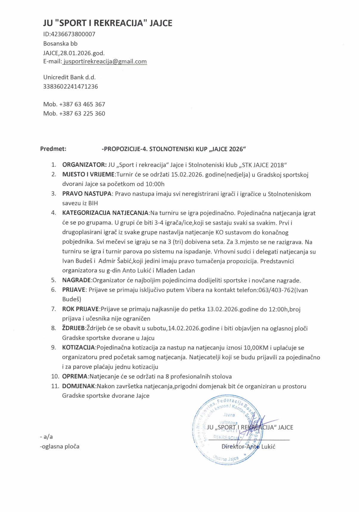 Povodom Dana Općine Jajce Stolnoteniski klub “Jajce 2018” i JU “Sport i rekreacija” organiziraju 4. Stolnoteniski kup “Jajce 2026”.