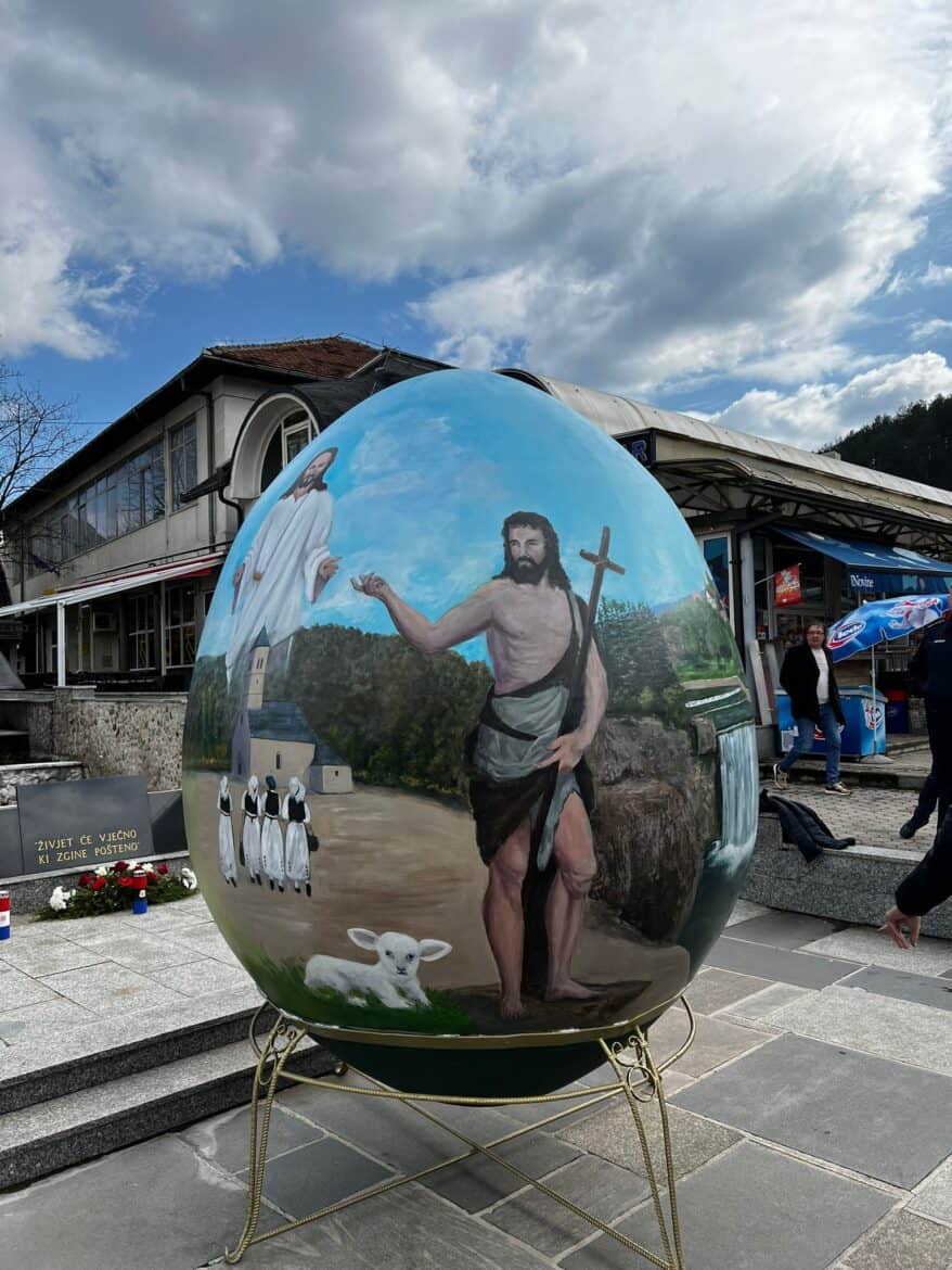 Pisanicu od poliesterske smole impresivnih dimenzija 296cm x 205cm koja je ujedno i jedna od najvećih na Balkanu, izradili su umjetnici iz Novog Travnika, inače članovi udruge „Naša zemlja“, a oslikao ju je Alojzije Gašparević, umjetnik iz Žepča koji je vrlo uspješno na pisanicu prenio Uskrsne motive i ljepote našeg jajačkog kraja.