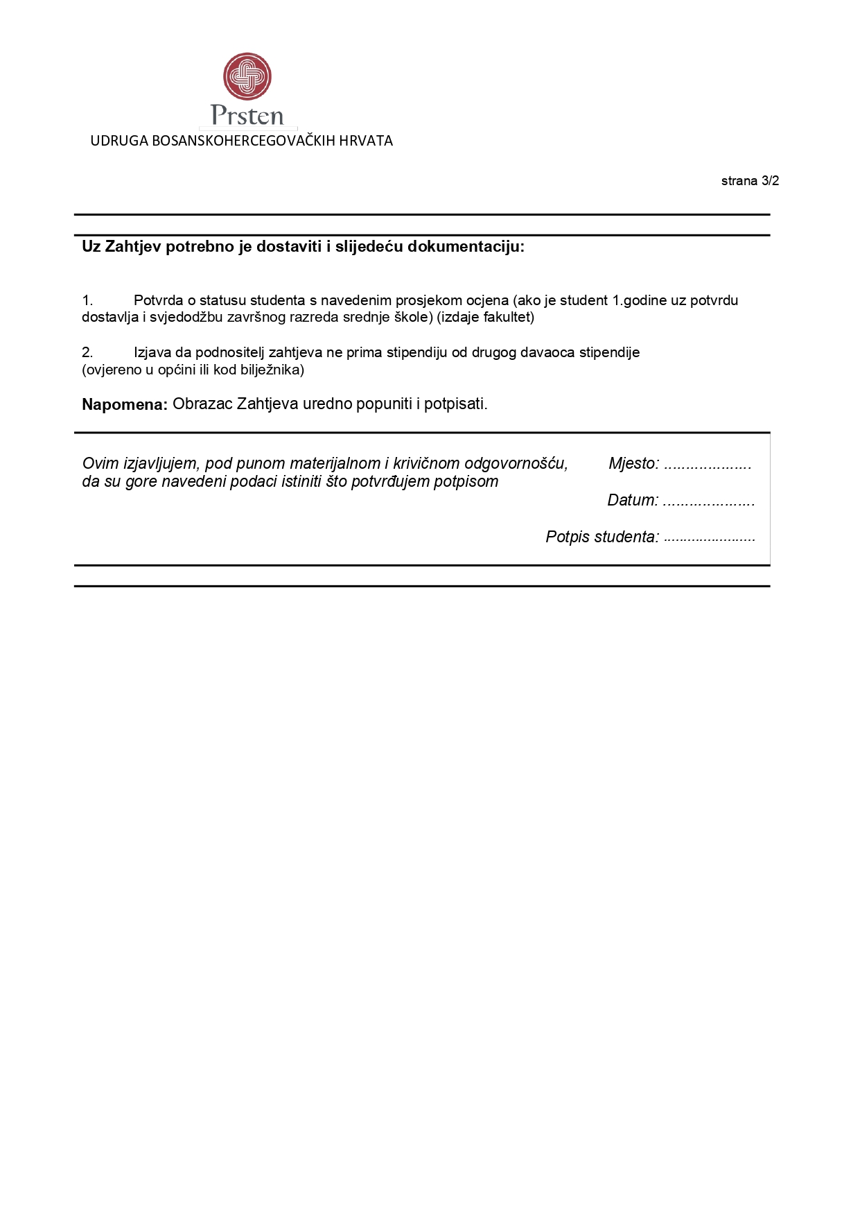 – Izjava da podnositelj zahtjeva ne prima stipendiju od drugog davaoca stipendije (ovjereno u općini ili kod bilježnika)