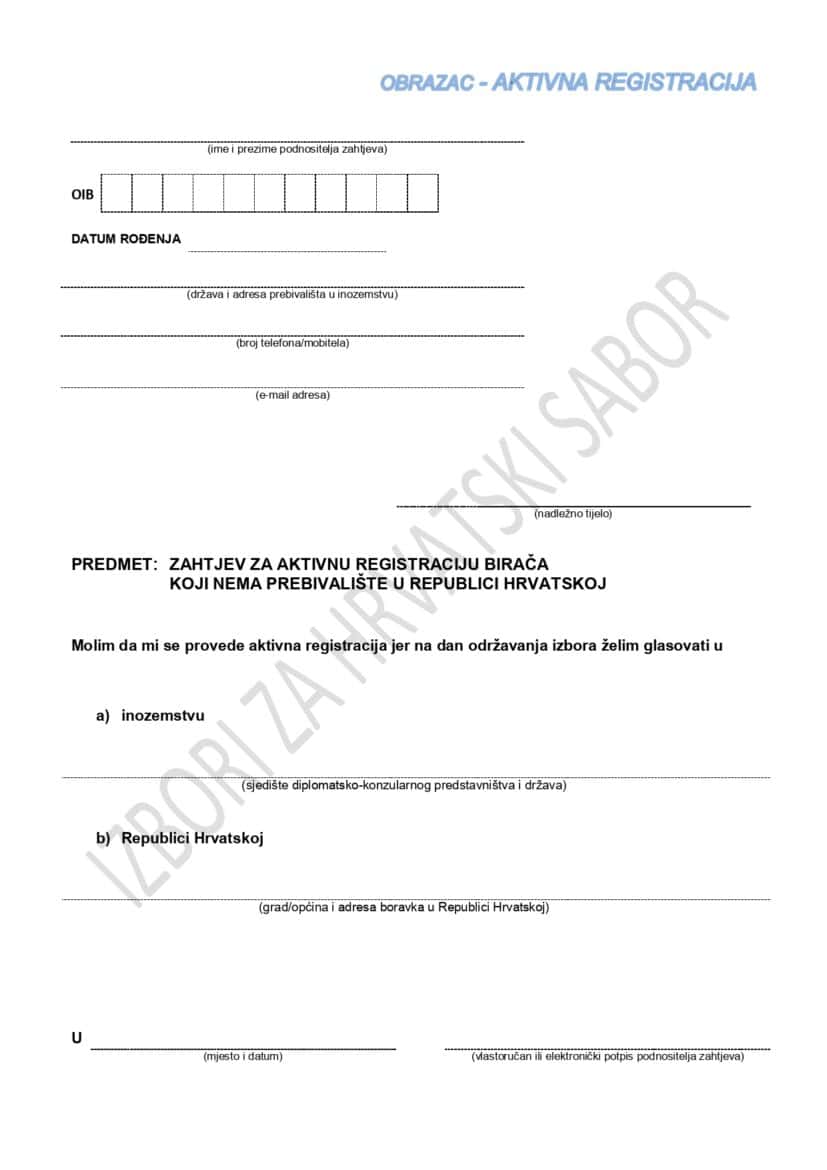 - a) Birači koji nemaju prebivalište u Republici Hrvatskoj i nemaju osobnu iskaznicu s podatkom o prebivalištu izvan Republike Hrvatske, moraju podnijeti ZAHTJEV ZA AKTIVNU REGISTRACIJU kako bi mogli glasovati u inozemstvu ili u Republici Hrvatskoj.